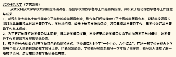 專家組對我校的教學督導工作給予了充分肯定和認可:從武漢科技大學學校案例和現場演講看,感到學校的教學督導工作是有傳統的,并積累了成功的教學督導工作經驗與成果。學校領導長期以來非常重視本科教學督導工作。教學督導工作緊跟教育發展形勢站位高。教學督導已形成了具有學校特色的原則和方式,學校歸結為8個字“一個中心、六個結合”,在這一教學督導理念下學校每年做了大量的有效的教學督導工作。