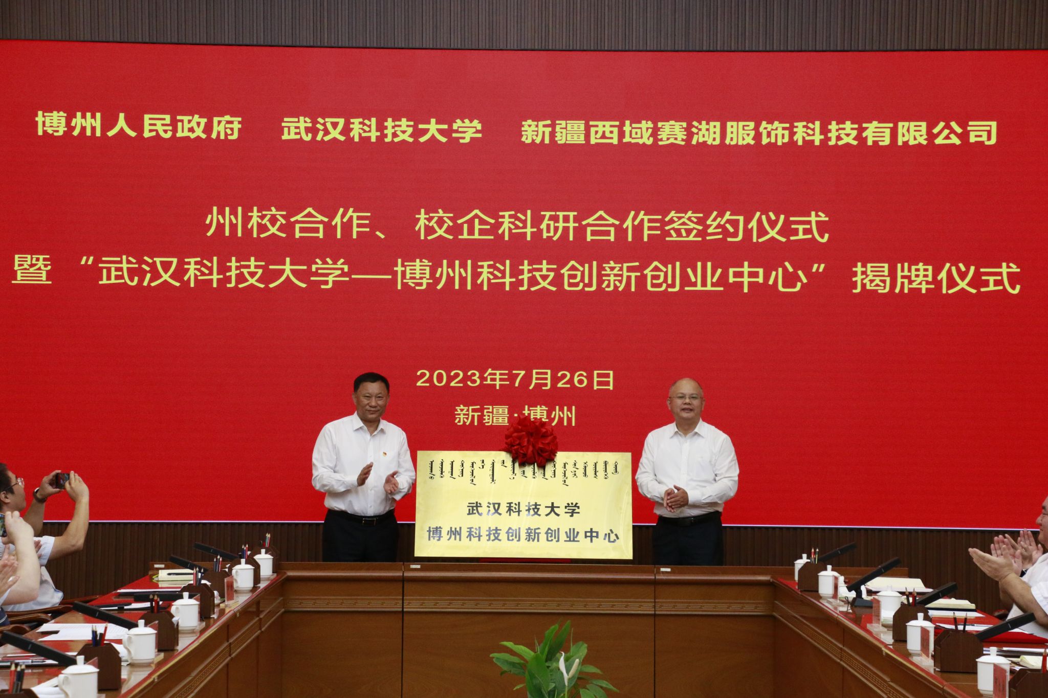 校黨委書記徐雁冰,博州黨委副書記、州長巴音克西致辭。校長倪紅衛與博州州長巴音克西為“武科大—博州科技創新創業中心”揭牌。校黨委副書記孫國勝與博州黨委常委、副州長阿爾特簽訂州校合作框架協議。霍開富教授與新疆西域賽湖服飾科技有限公司簽署技術服務合同。合作儀式由博州黨委副書記、湖北省援疆工作前方指揮部黨組書記、總指揮方向榮主持。