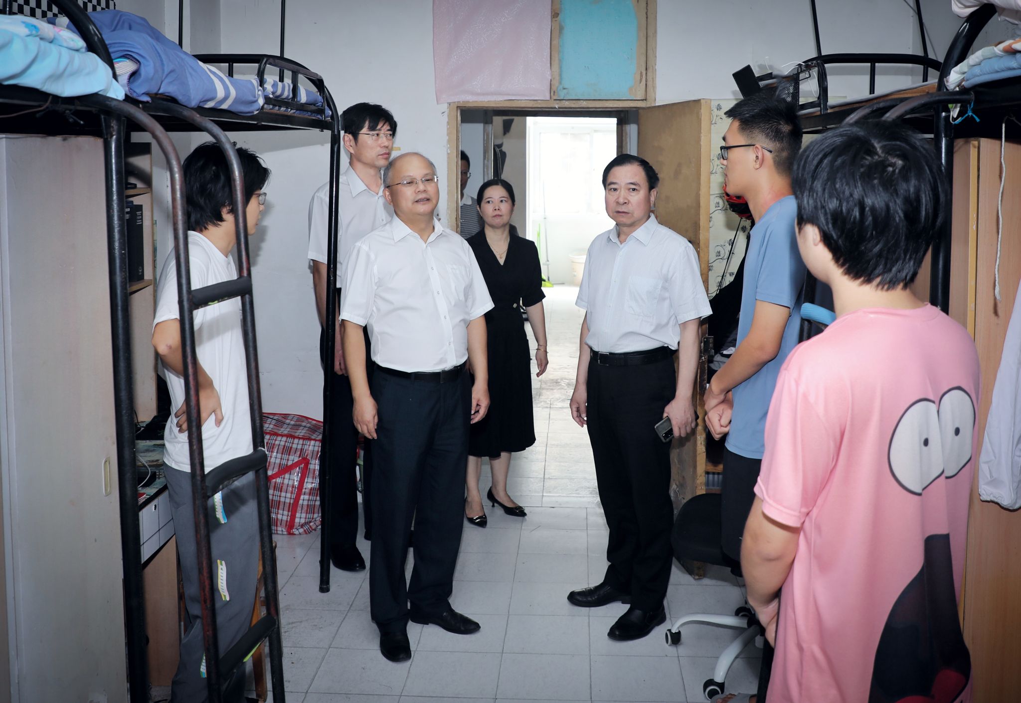 校領導一行先后來到青山校區西院小樹林廣場、室外運動場、人行天橋建設項目、春華餐廳、人和學生公寓,詳細了解各單位暑期工作的開展情況和開學準備工作的籌備事宜,就校園環境改造、教學條件保障、生活后勤保障、校園安全保衛、食品衛生安全等情況進行檢查,并看望了從黃家湖校區搬遷至青山校區的學生。