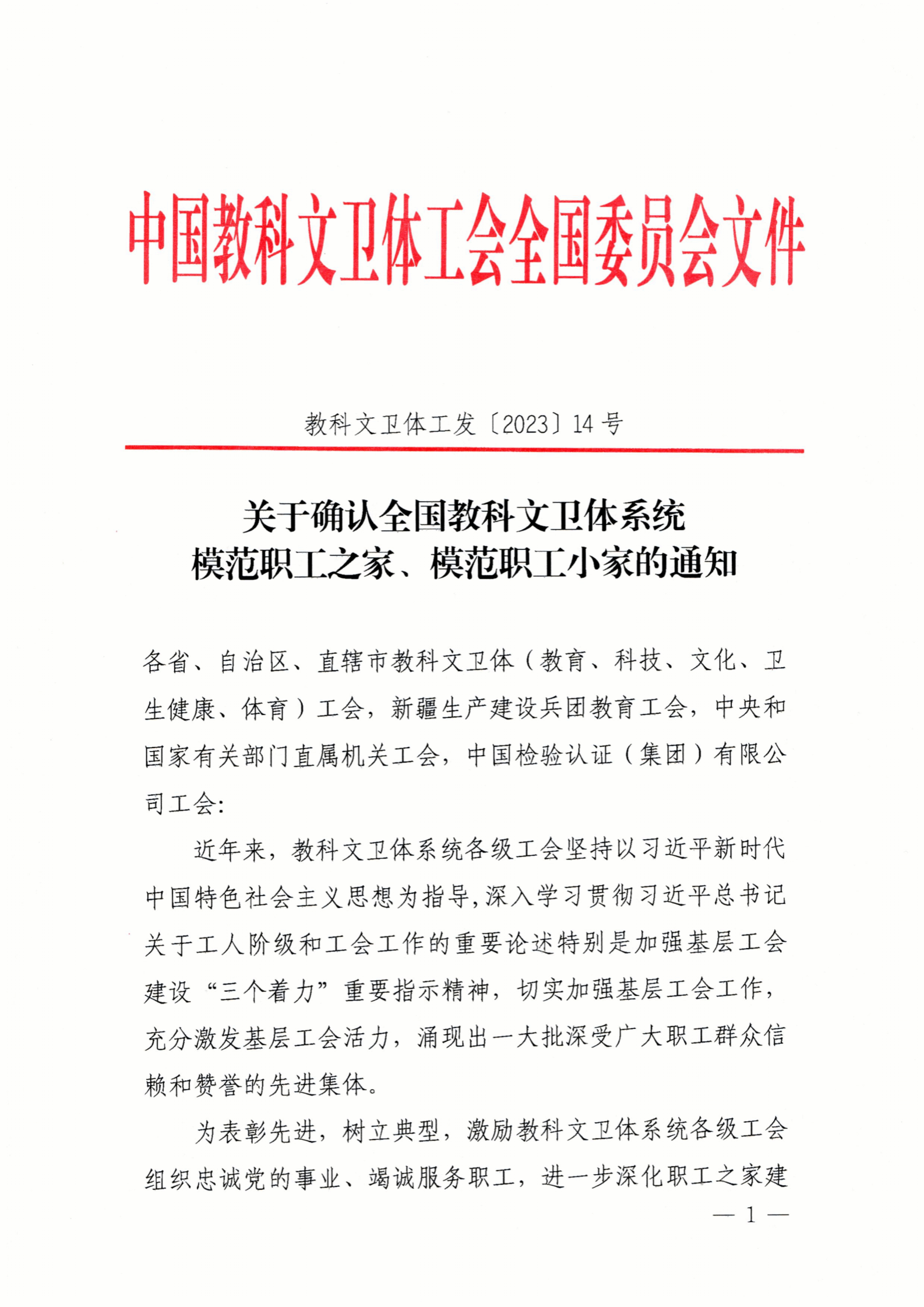武科大網訊 8月28日,中國教科文衛體工會全國委員會印發了《關于確認全國教科文衛體系統模范職工之家、模范職工小家的通知》(教科文衛體工發〔2023 〕14號),我校工會獲批全國教科文衛體系統模范職工之家。