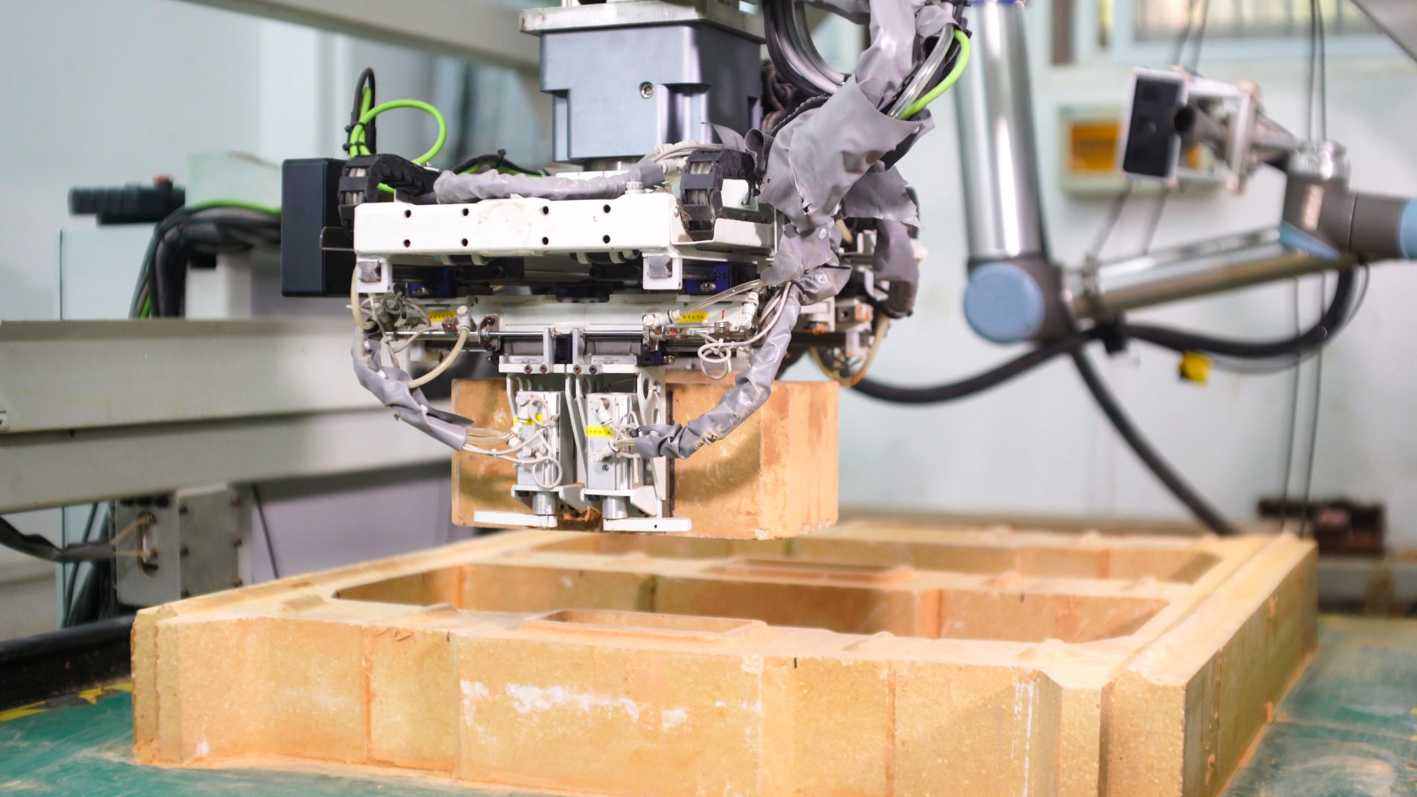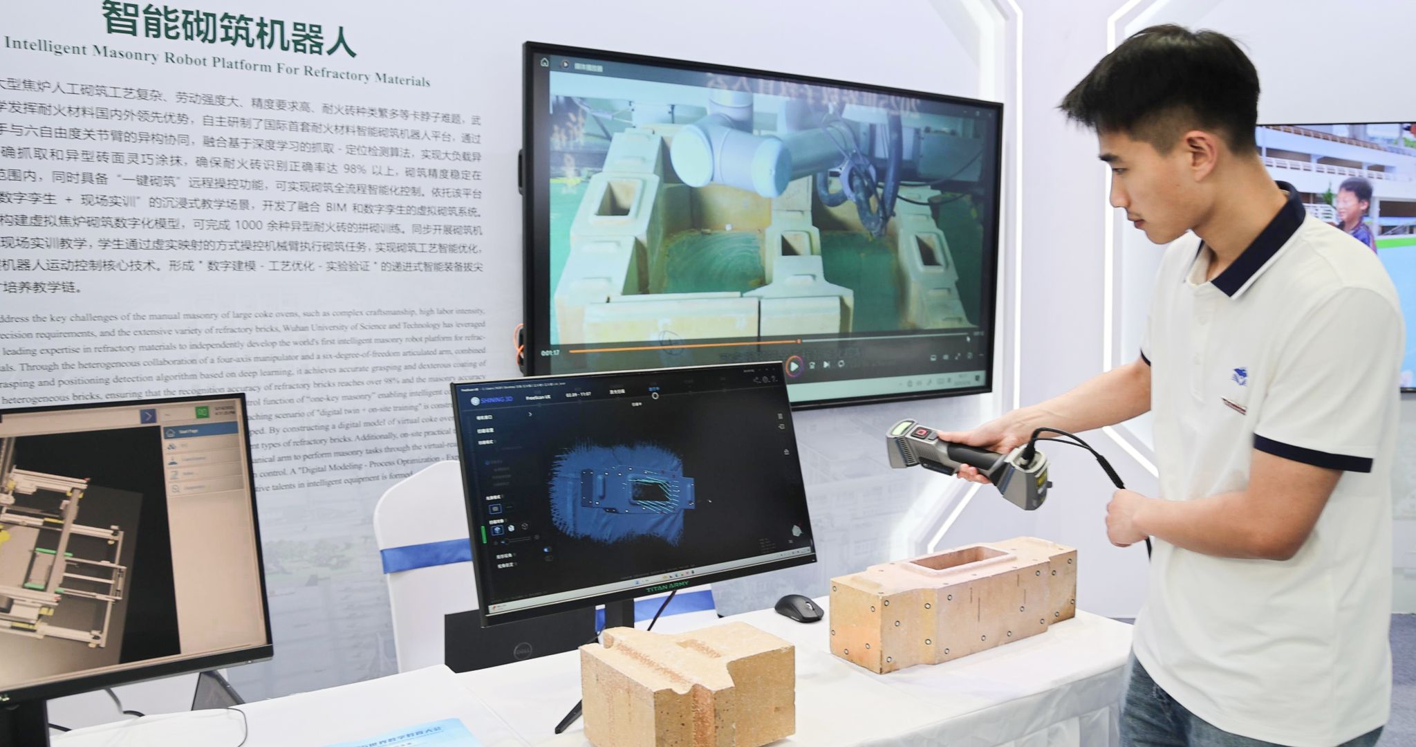 在現場觀摩點,工作人員手持三維掃描裝置,短短數秒就能將一塊耐火磚轉化為數字模型,并在虛擬空間中完成砌筑仿真與機械臂運動控制;輕觸屏幕啟動“一鍵砌筑”,機器臂便可自動完成從抓取、涂漿到砌筑的全流程操作。