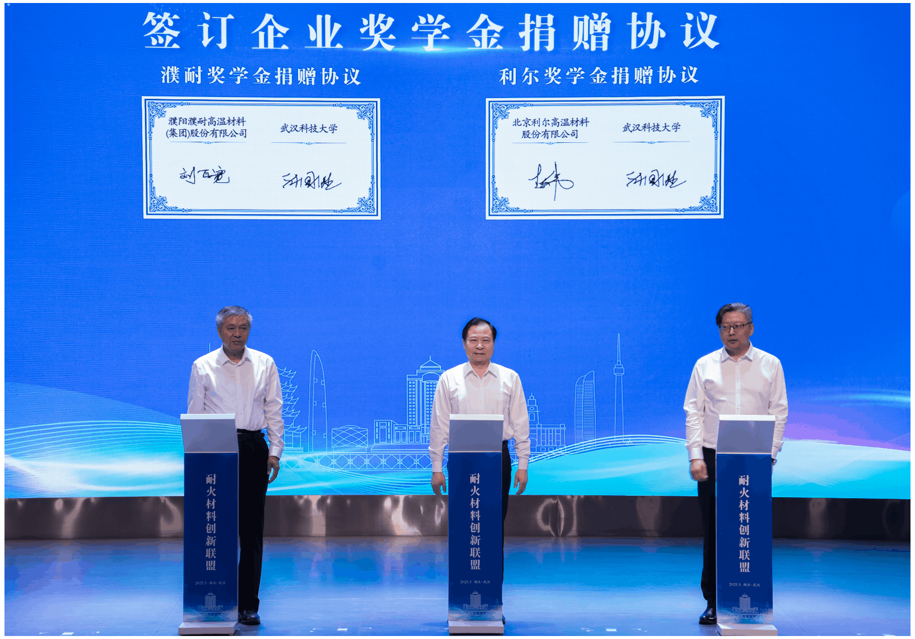 倪紅衛代表武漢科技大學與中鋼洛耐科技股份有限公司董事長熊建、濮陽濮耐高溫材料(集團)股份有限公司董事長劉百寬、北京利爾高溫材料股份有限公司董事長趙偉等12家企業負責人簽訂《耐火材料創新聯盟共建協議書》。校企各方將聚焦耐火材料領域科技創新,在人才培養、科學研究、學術交流和學科建設等方面深化合作,積極探索產教融合發展的“耐火材料人才培養與科技創新”模式,致力于產出世界級原創性、前瞻性和系統性科研成果,助力武漢科技大學建設成為世界耐火材料人才培養、科學研究與學術交流中心,實現“雙一流”建設突破。