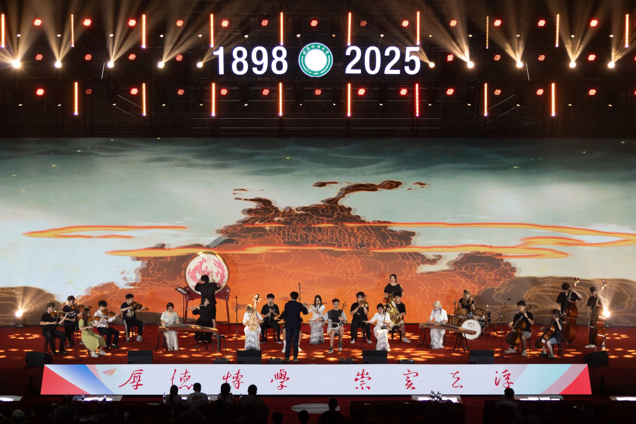 器樂演奏《云宮迅音(黑神話悟空)》讓經典旋律在中西樂器的音色碰撞中煥發全新魅力。節目融合了弦樂器、管樂器、打擊樂器等十余種樂器,經歷了長達八個月的精心籌備與排練打磨。節目負責人王泊驍說:“希望借此節目鼓勵畢業生們在低谷絕境時,能高舉手中金箍棒,放馬西行、直面天命,取得人生真經。”