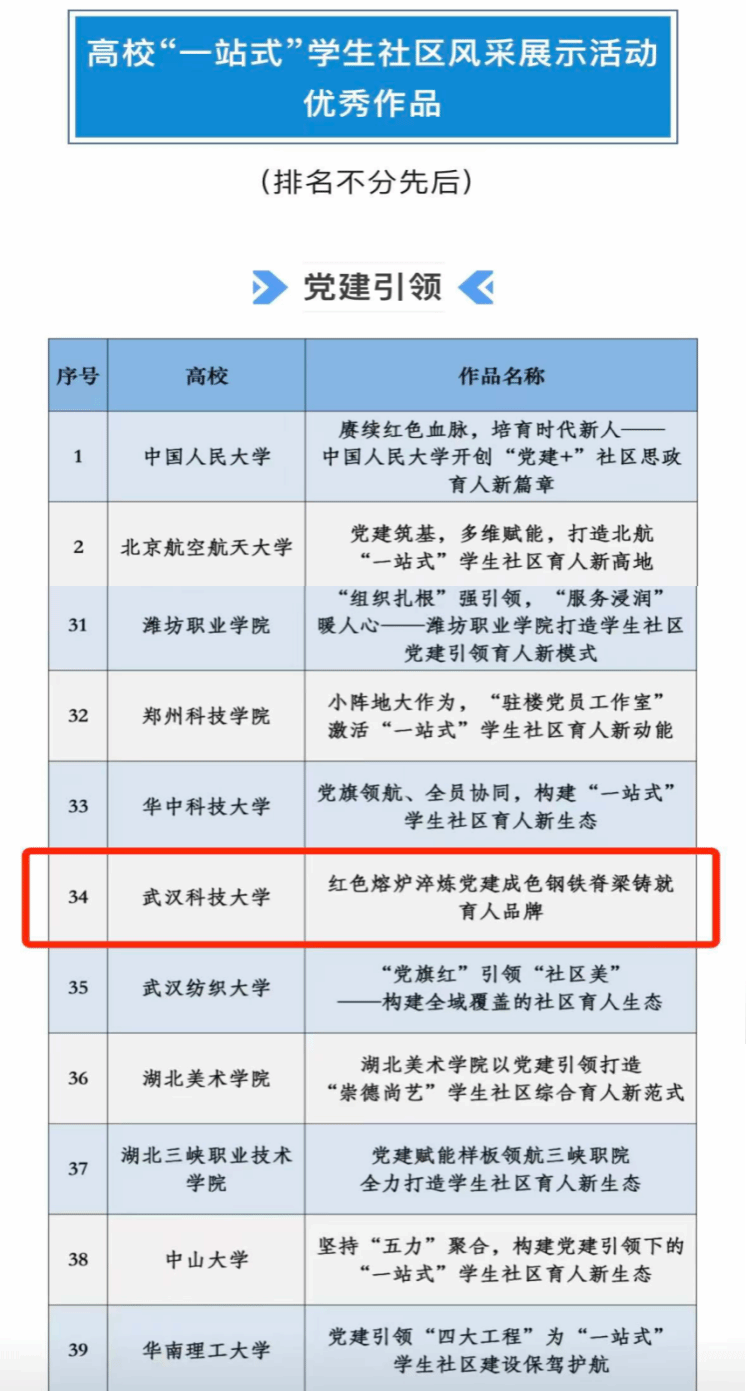 武科大網(wǎng)訊 近日,教育部思想政治工作司公布2025年高校“一站式”學(xué)生社區(qū)風(fēng)采展示活動優(yōu)秀成果評選結(jié)果,我校報送的《紅色熔爐淬煉黨建成色 鋼鐵脊梁鑄就育人品牌》入選“黨建引領(lǐng)”類別優(yōu)秀成果。這是我校首次榮獲該類別榮譽(yù),標(biāo)志著學(xué)校“一站式”學(xué)生社區(qū)建設(shè)取得突破性進(jìn)展。
