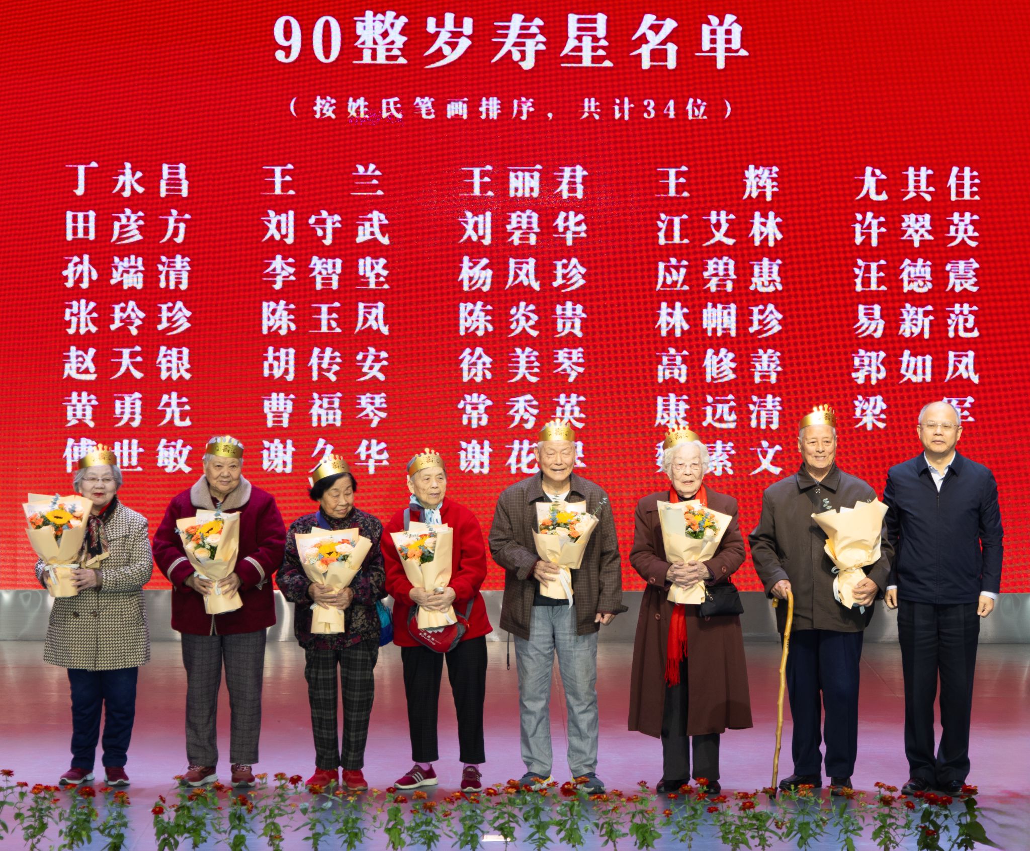 活動現(xiàn)場溫情滿溢,學(xué)校為70、80、90整歲的老壽星們舉行了集體祝壽儀式。倪紅衛(wèi)、沈季偉、劉時新分別為壽星們送上生日祝福和慰問。