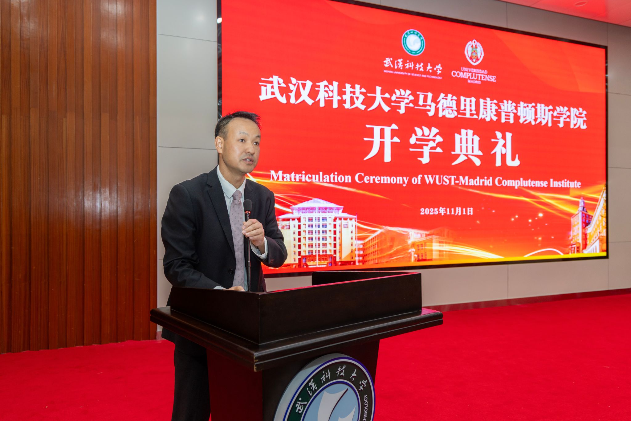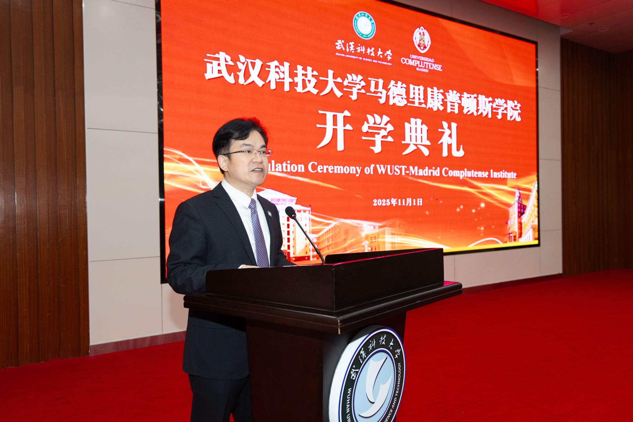 武科大網訊(記者肖宇瑄 見習記者胡泰山)11月1日上午,武漢科技大學馬德里康普頓斯學院2025級新生開學典禮在黃家湖校區崇實會堂隆重舉行。湖北省教育廳副廳長戴偉,西班牙馬德里康普頓斯大學校長華金·戈亞契·戈尼,我校黨委書記倪紅衛,黨委副書記、校長呂勇等中西嘉賓與274名馬德里康普頓斯學院首屆新生齊聚一堂,共同見證這一歷史性時刻。開學典禮由我校副校長董麗杰主持。
