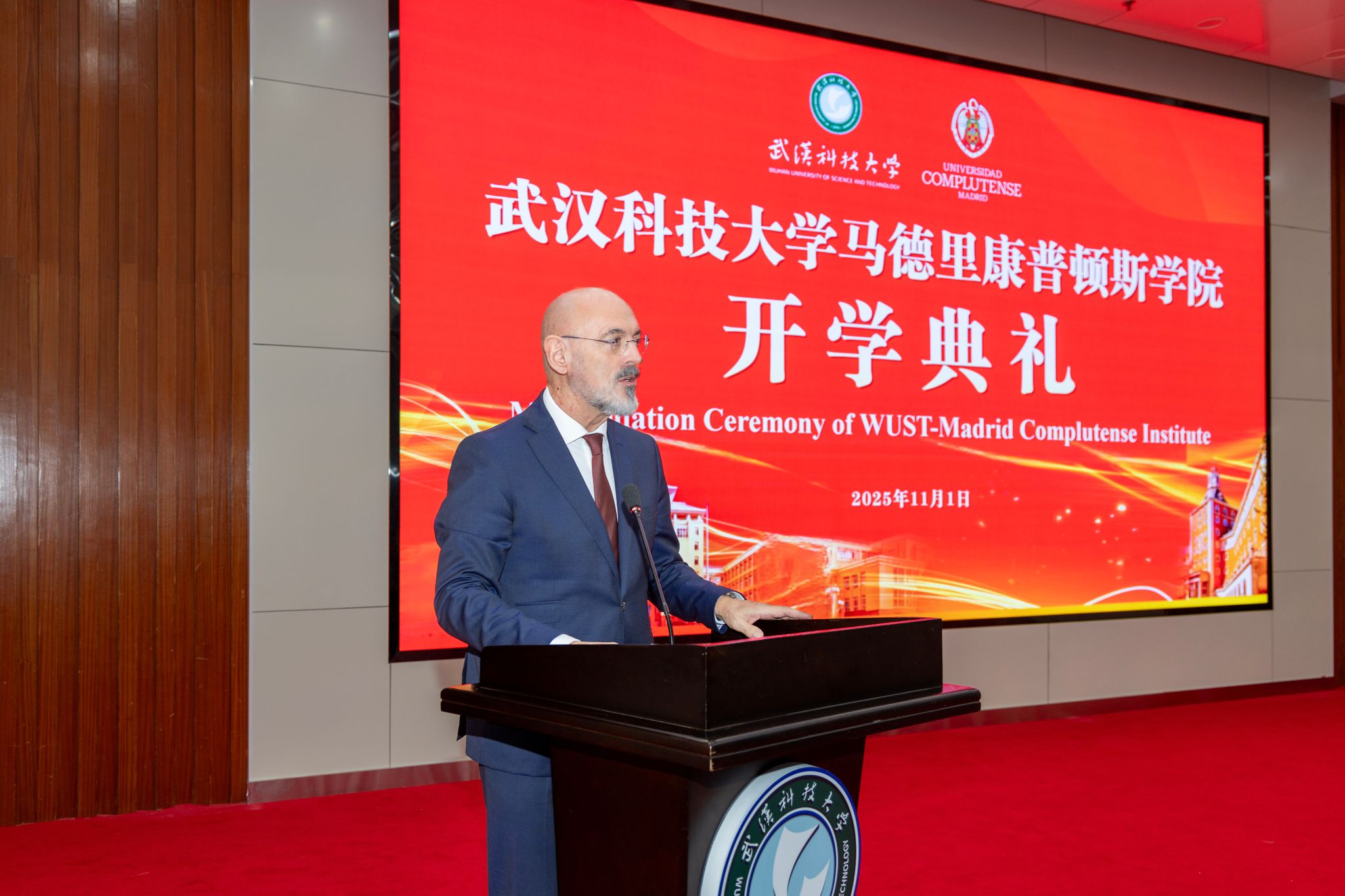華金·戈亞契·戈尼在致辭中盛贊此次合作是“一座連接兩種文化、兩段歷史和兩種知識體系的橋梁”,它將武漢科技大學在工程應用領域的雄厚實力與馬德里康普頓斯大學在人文社科領域的悠久傳統完美融合。他特別引用中國思想家孔子的名言“知者不惑,仁者不憂,勇者不懼”寄語新生,強調真正的智慧、仁愛與勇氣是教育的根基與人生的力量,并希望同學們通過學習,成長為既能推動科技進步,又心懷人類福祉的未來英才。