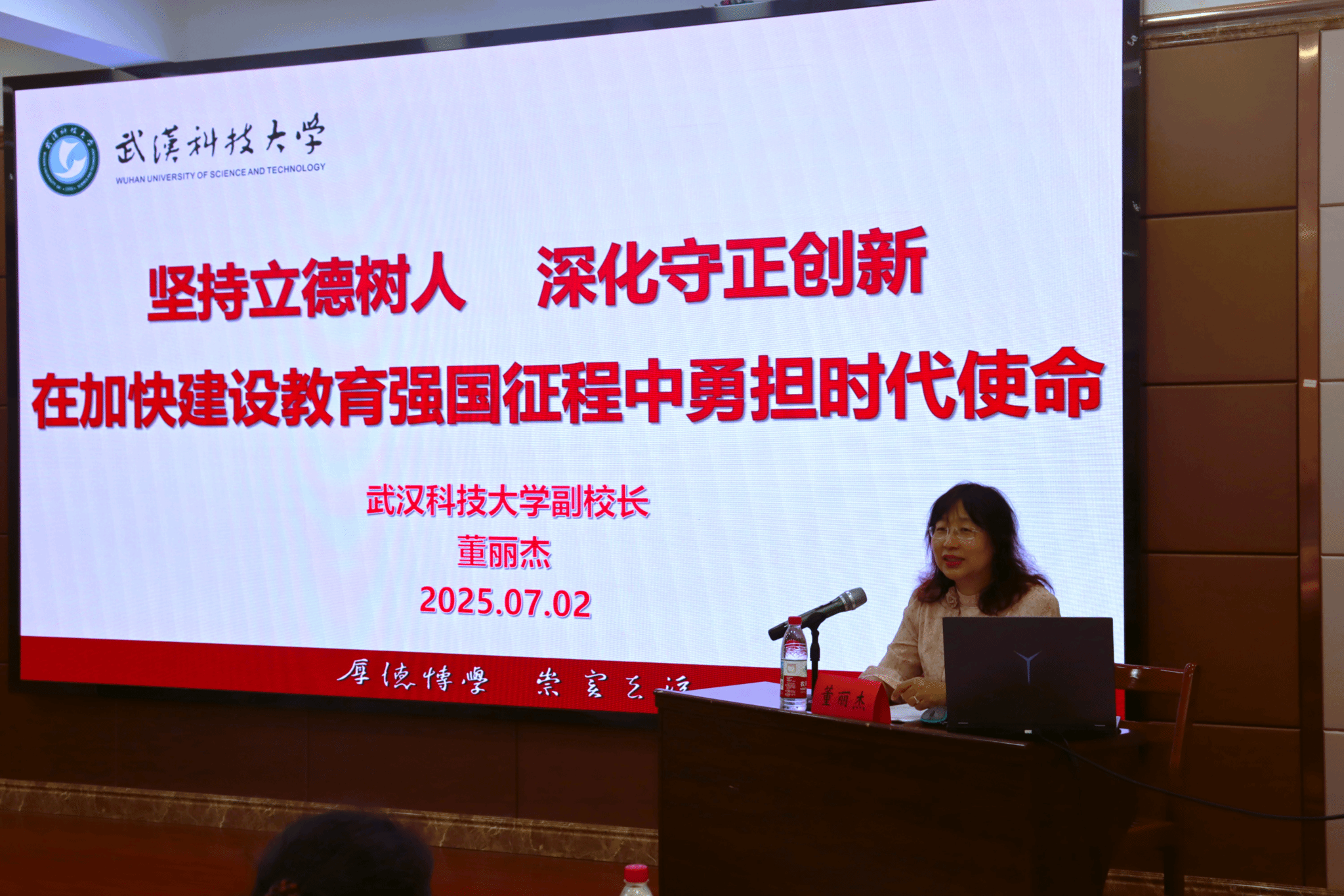 武科大網(wǎng)訊(通訊員李子怡) 7月2日上午,副校長董麗杰在黃家湖校區(qū)教七樓70308報(bào)告廳為化學(xué)與化工學(xué)院師生講授題為“堅(jiān)持立德樹人,深化守正創(chuàng)新——在加快建設(shè)教育強(qiáng)國征程中勇?lián)鷷r(shí)代使命”的主題思政課。學(xué)院黨委書記劉抗強(qiáng)、副書記余婷以及教師、學(xué)生代表110余人參加,劉抗強(qiáng)主持活動。