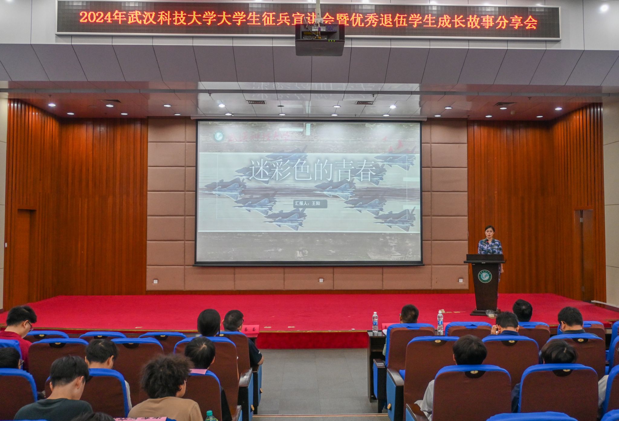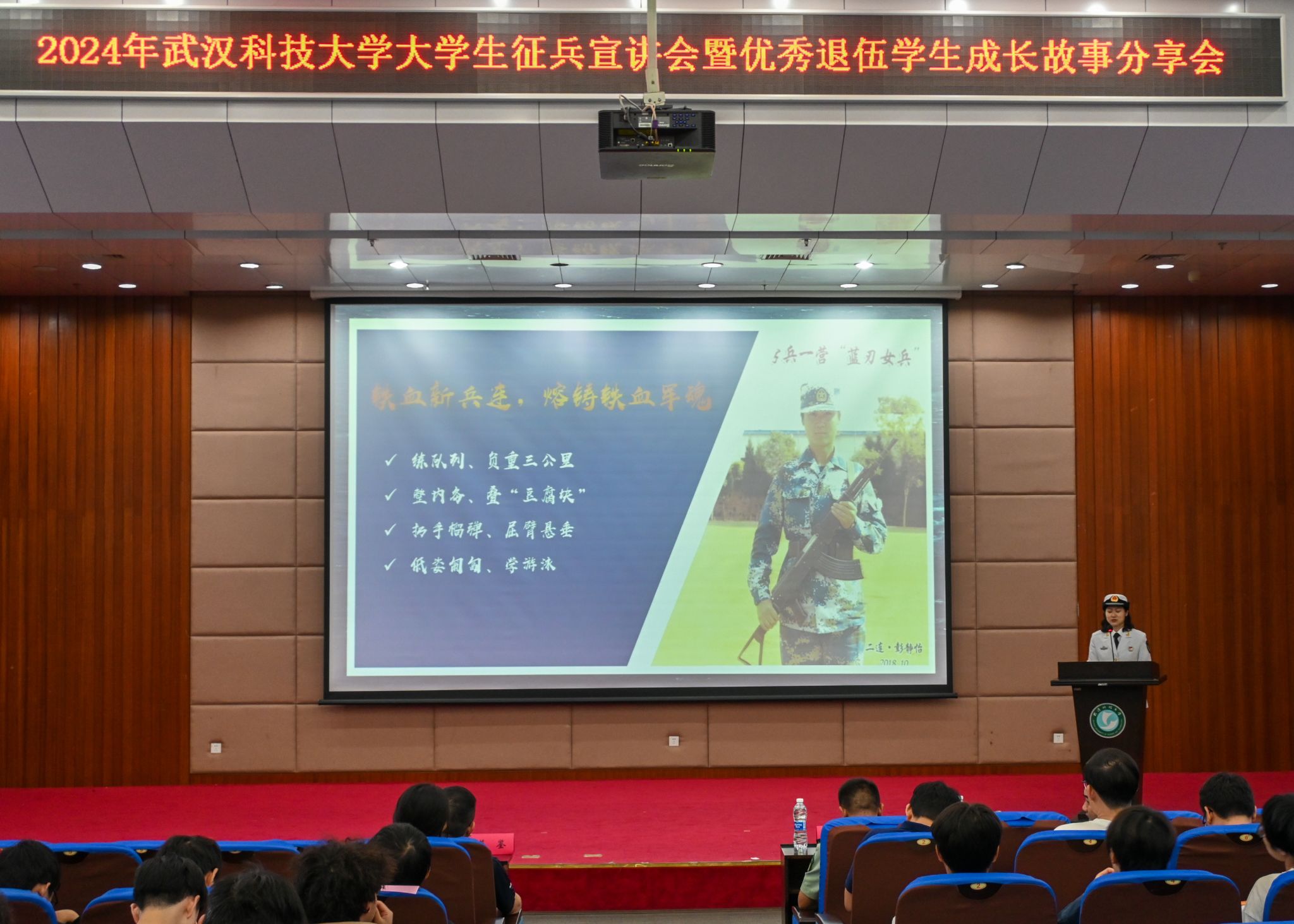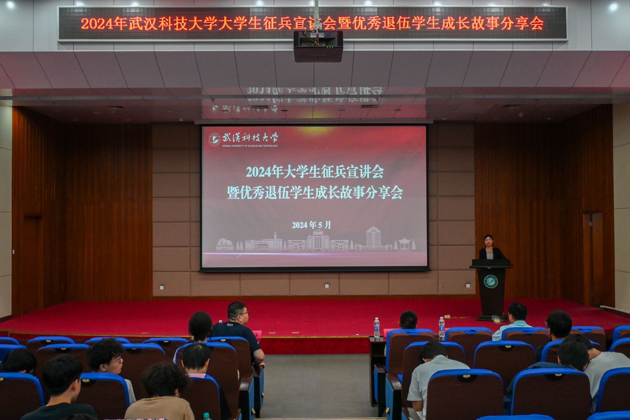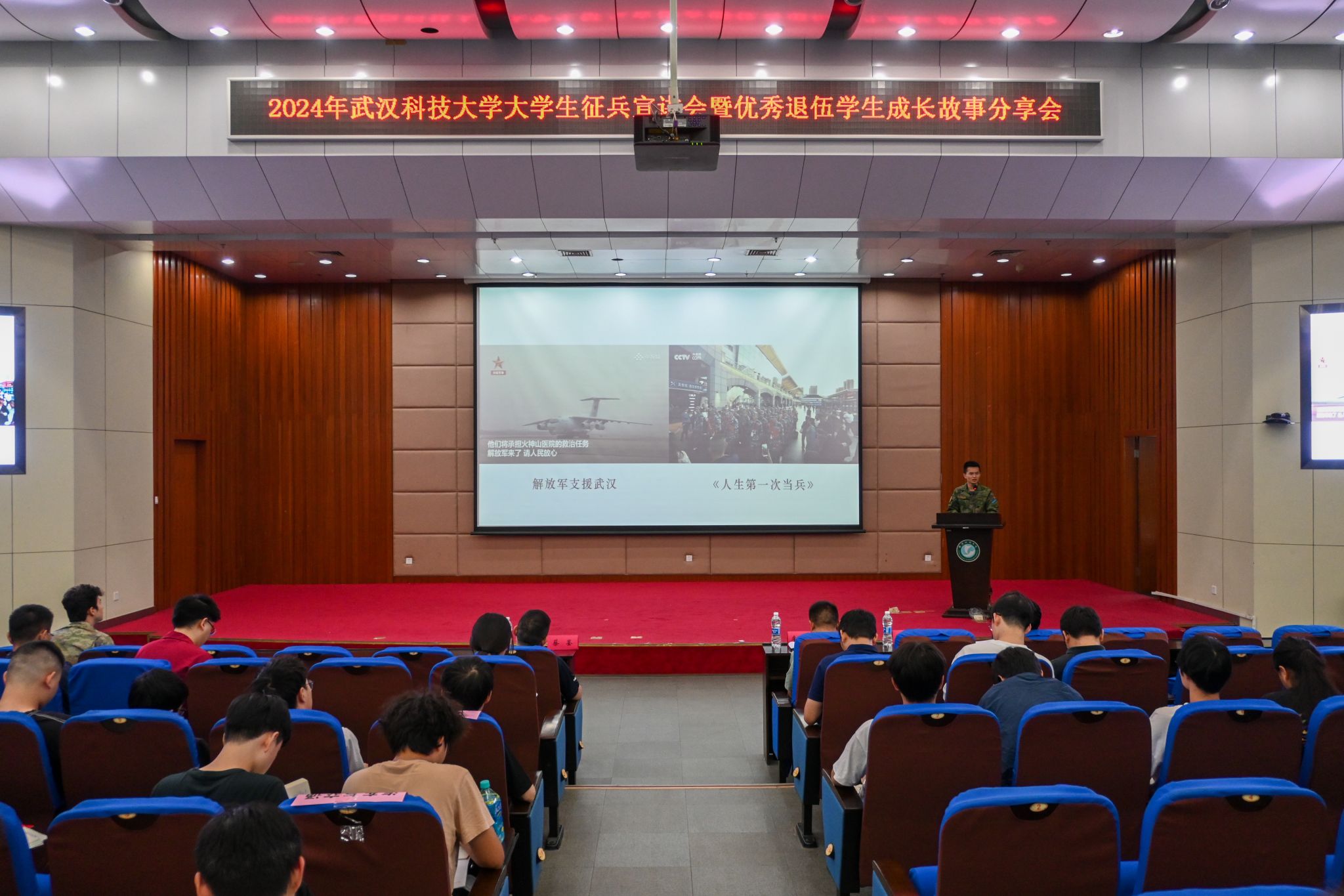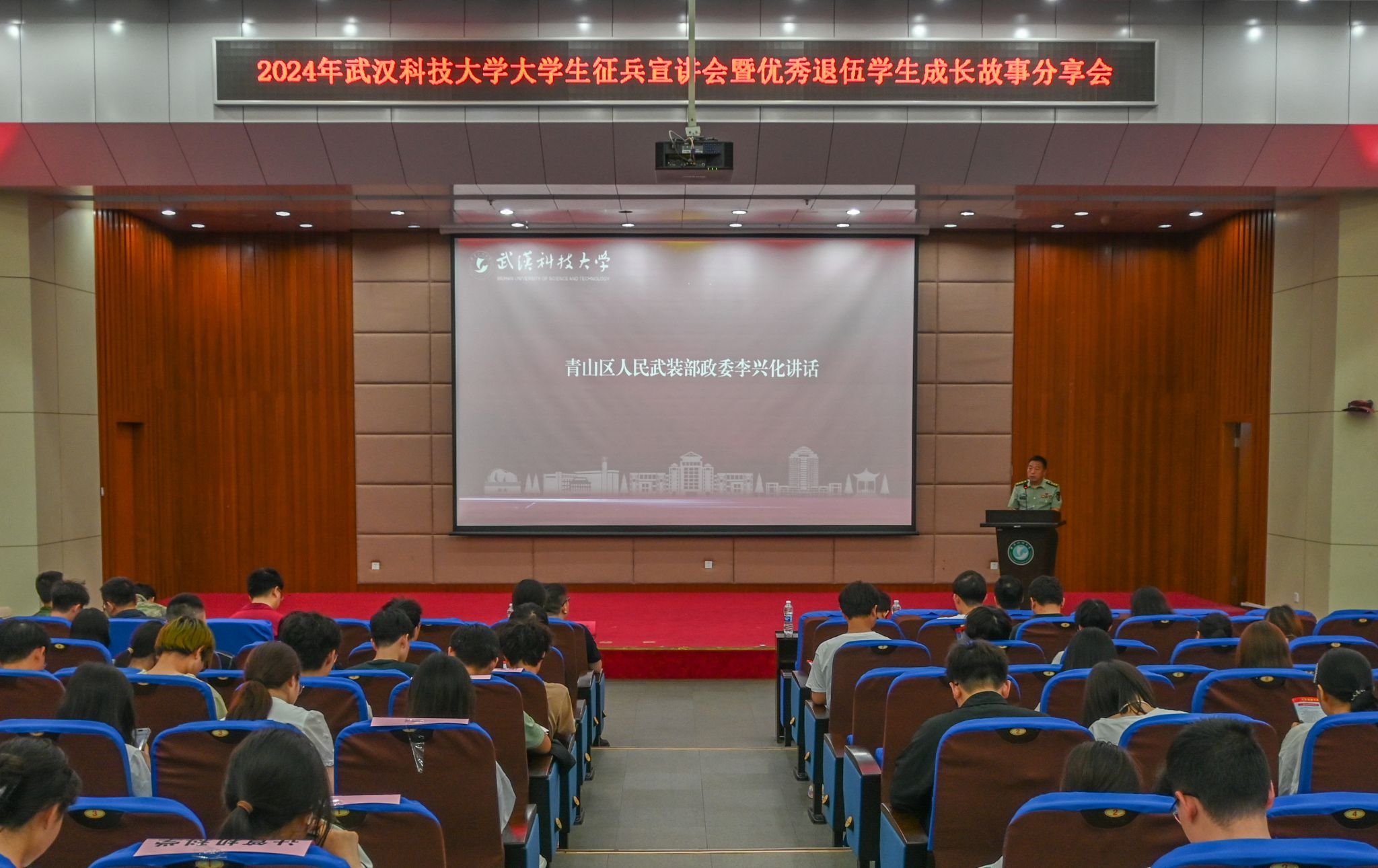 5月22日晚,武漢科技大學(xué)2024年征兵宣講會(huì)暨優(yōu)秀退伍學(xué)生成長(zhǎng)故事分享會(huì)在我校黃家湖校區(qū)崇實(shí)會(huì)堂舉行。黨委學(xué)生工作部副部長(zhǎng)蔡鑒致辭。青山區(qū)人民武裝部政委李興化講話。優(yōu)秀退伍大學(xué)生代表彭靜怡、郭志權(quán)、馬煜焜、王陽(yáng)、艾尼卡爾·阿斯卡爾依次上臺(tái)分享自己的軍旅生活。青山區(qū)人民武裝部參謀王思做入伍政策宣講。(馬茜云 黃宏杰)