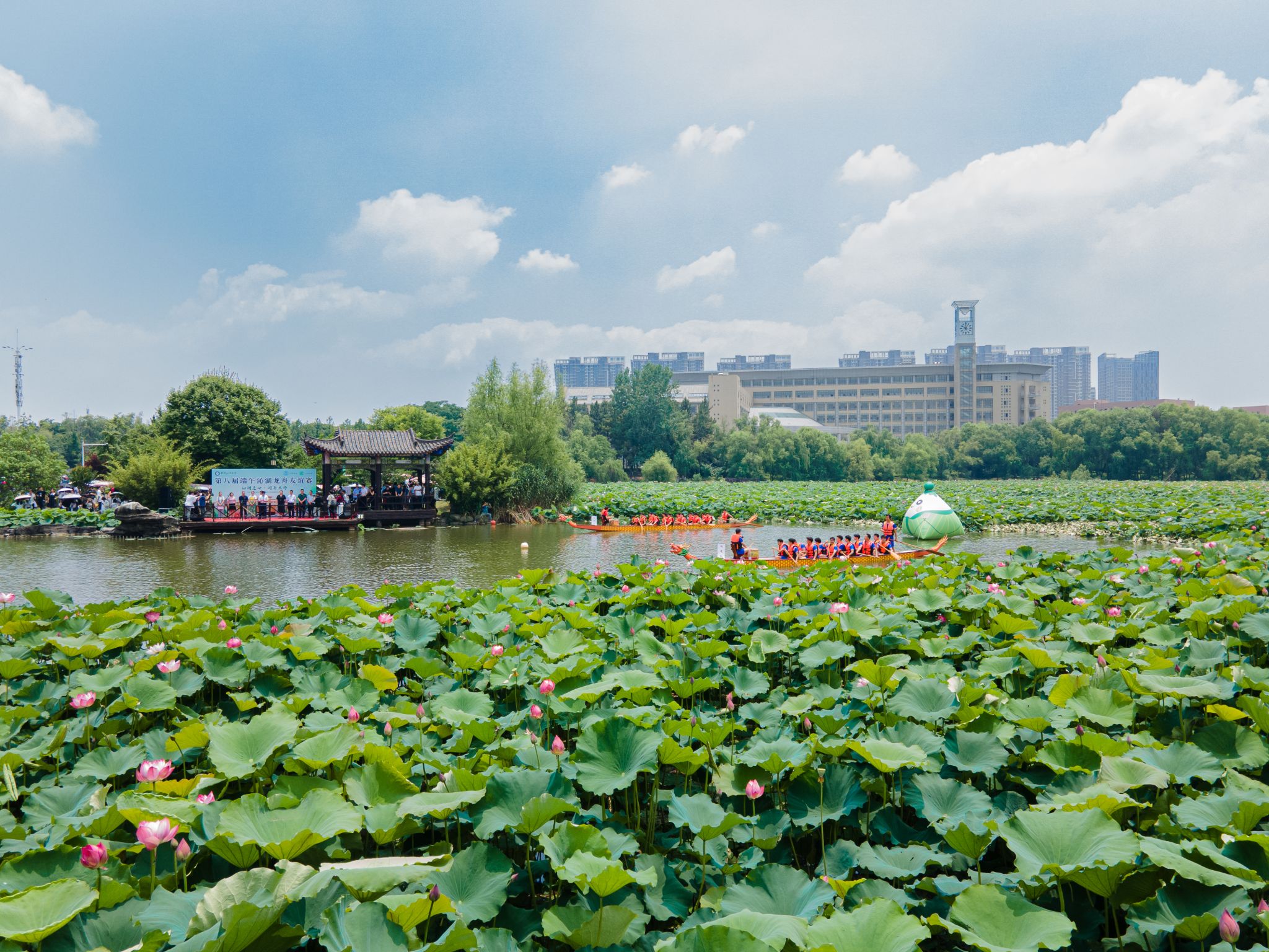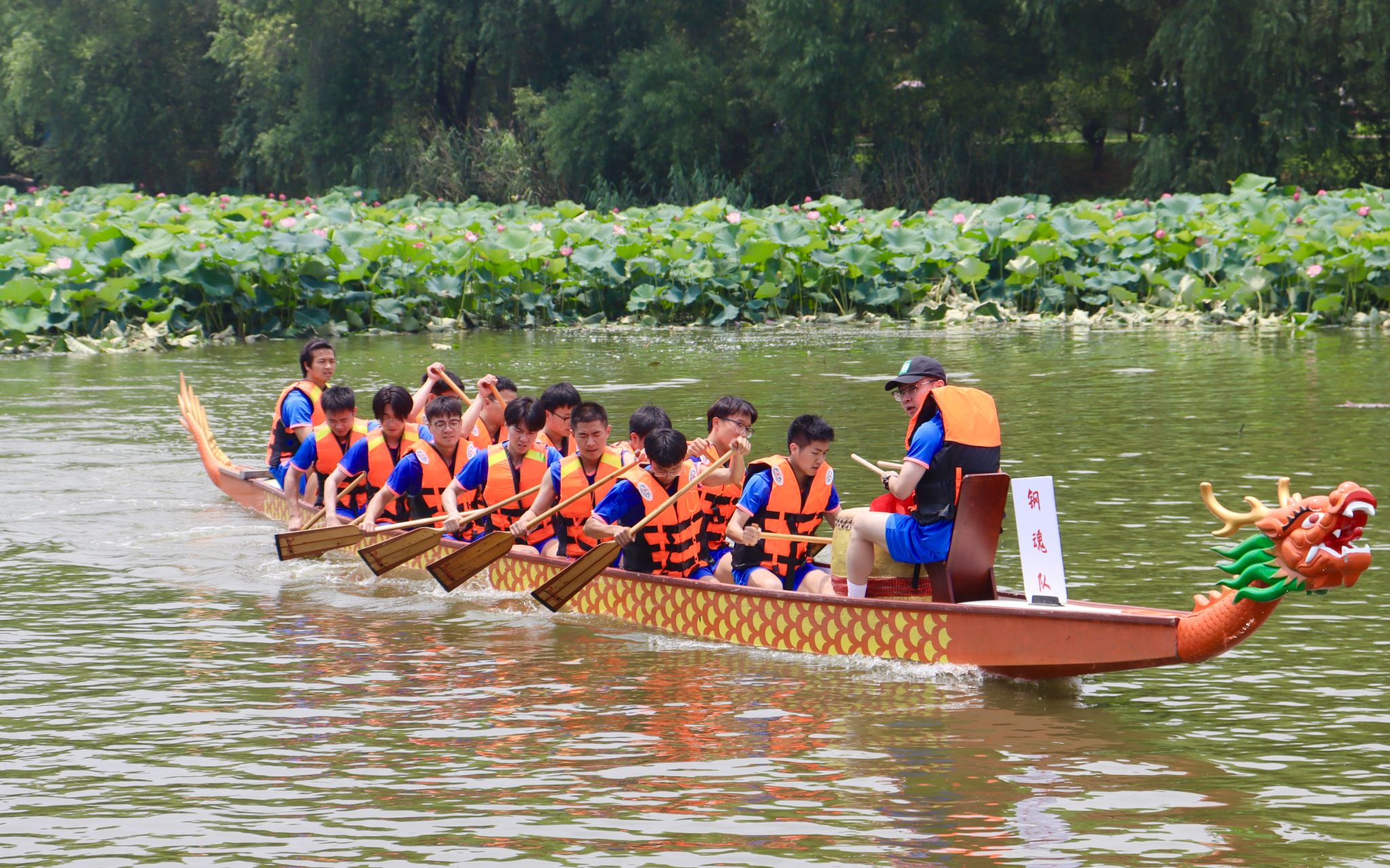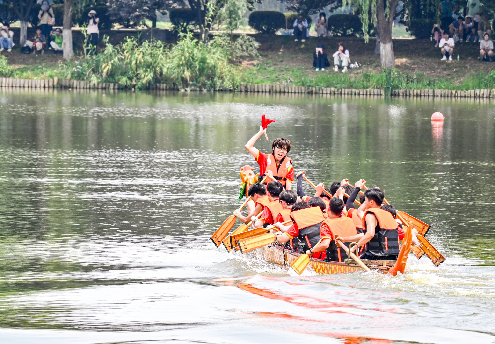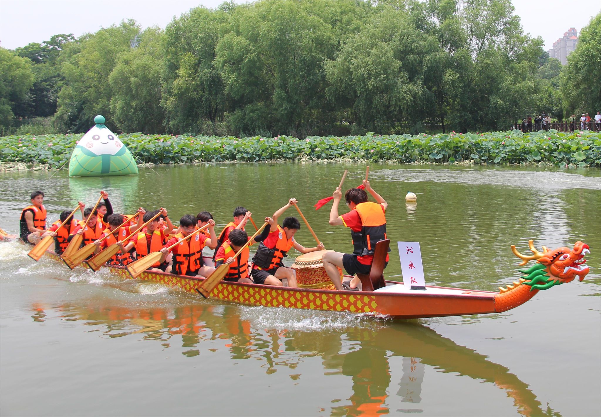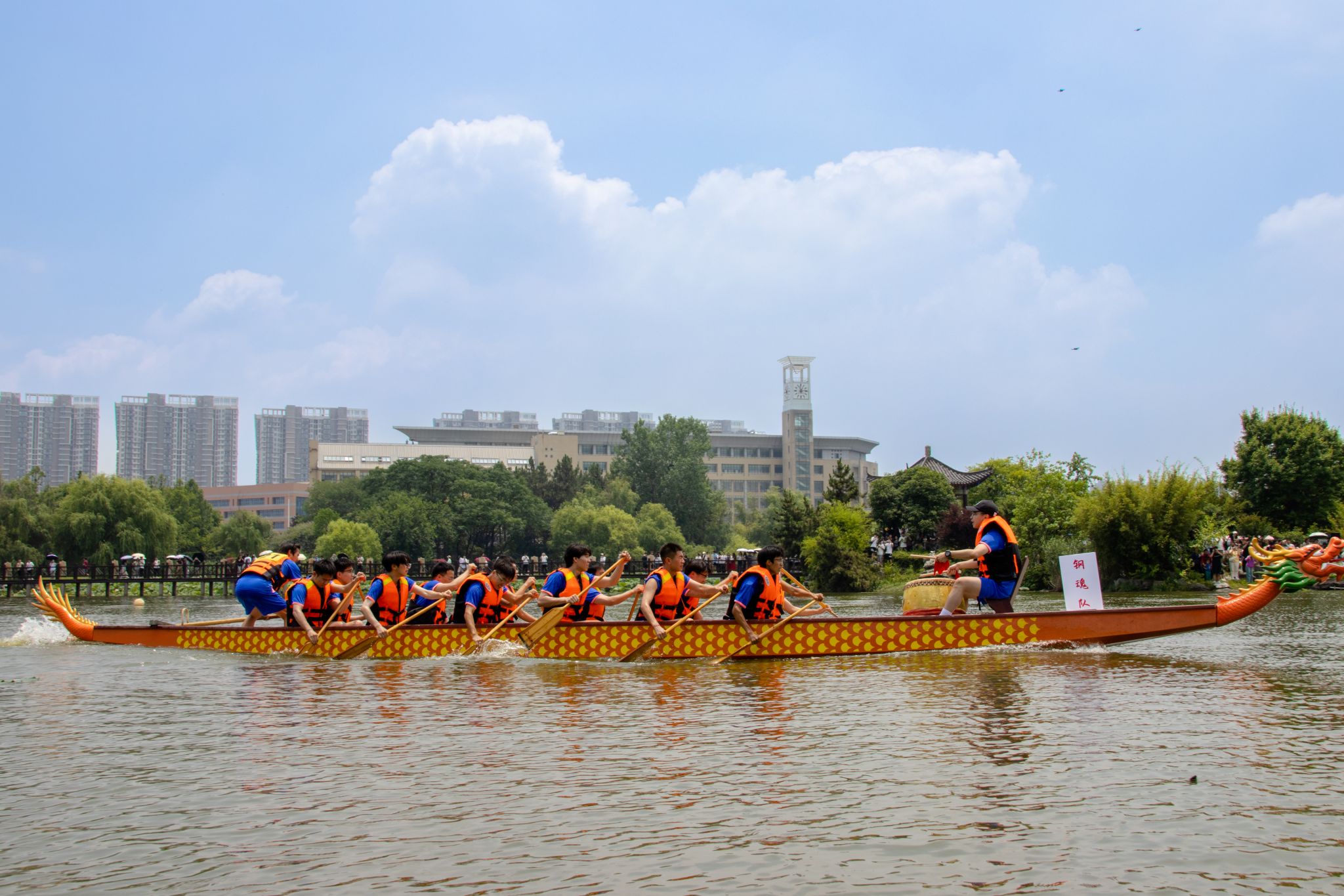 6月6日中午,我校于沁湖畔舉辦第八屆“沁湖連心·同舟共濟”端午龍舟友誼賽,副校長沈季偉致辭,校團委副書記向方新宣讀賽事競賽規則、運動員代表宣誓,黨委副書記孫國勝為龍舟點睛。由我校龍舟協會成員組成的“沁水”隊和由研究生組成的“鋼魂”隊角逐龍舟總決賽冠軍,“沁水”隊獲勝。現場還設置了系列端午文化主題展演,不少留學生參與包粽子、做艾草,體驗端午傳統文化。