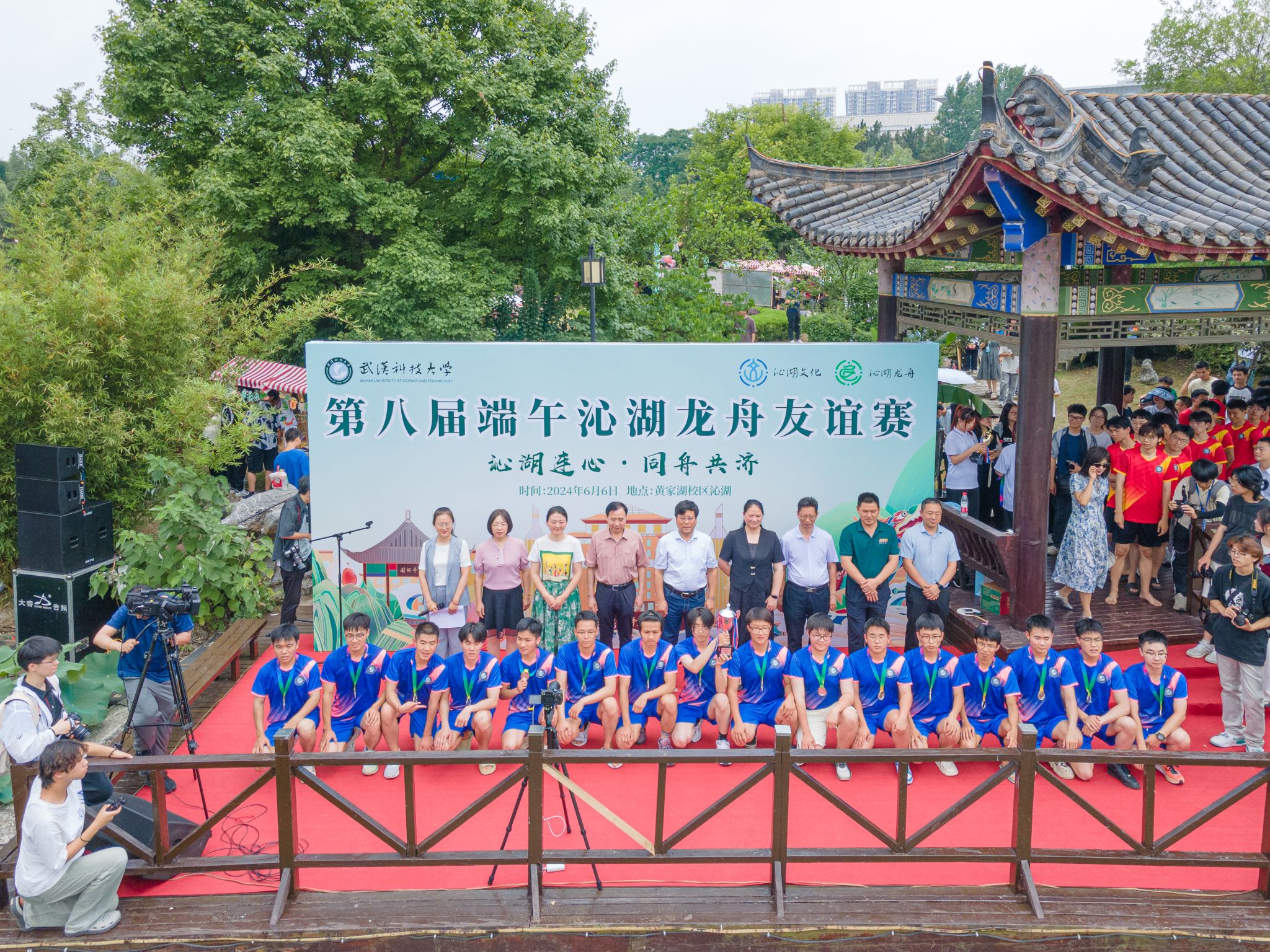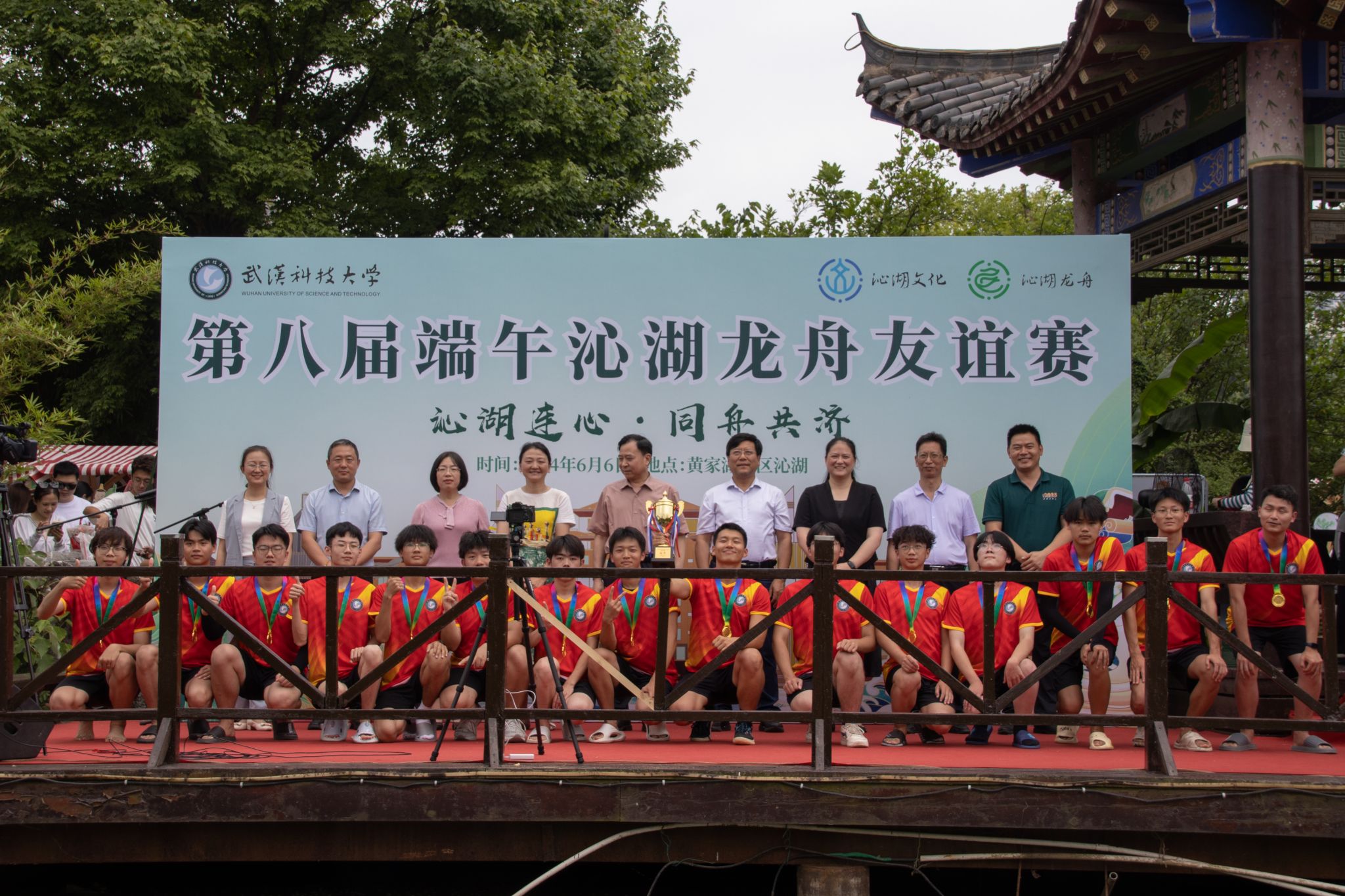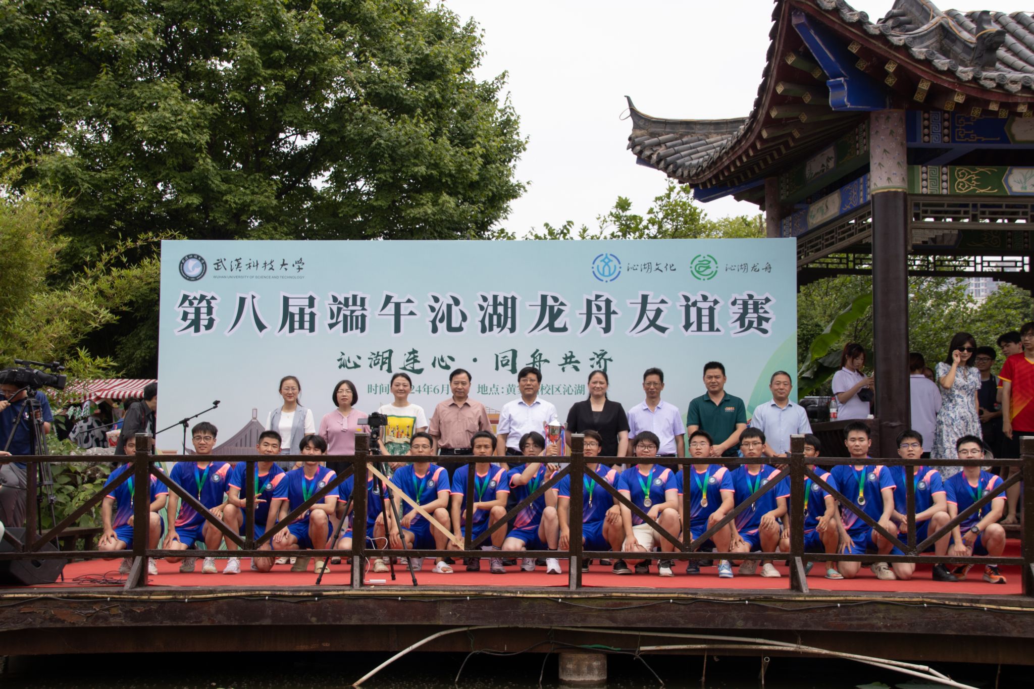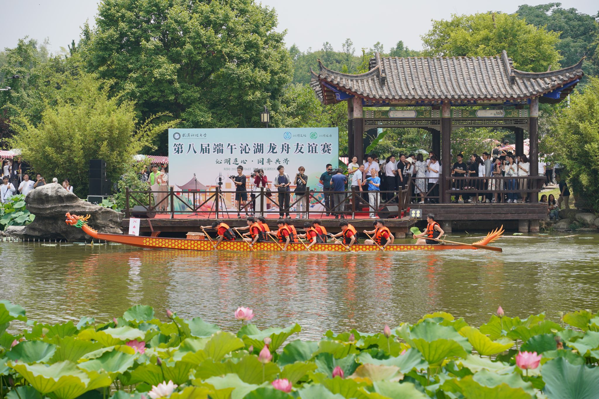 6月6日中午,我校于沁湖畔舉辦第八屆“沁湖連心·同舟共濟”端午龍舟友誼賽,副校長沈季偉致辭,校團委副書記向方新宣讀賽事競賽規則、運動員代表宣誓,黨委副書記孫國勝為龍舟點睛。由我校龍舟協會成員組成的“沁水”隊和由研究生組成的“鋼魂”隊角逐龍舟總決賽冠軍,“沁水”隊獲勝。現場還設置了系列端午文化主題展演,不少留學生參與包粽子、做艾草,體驗端午傳統文化。