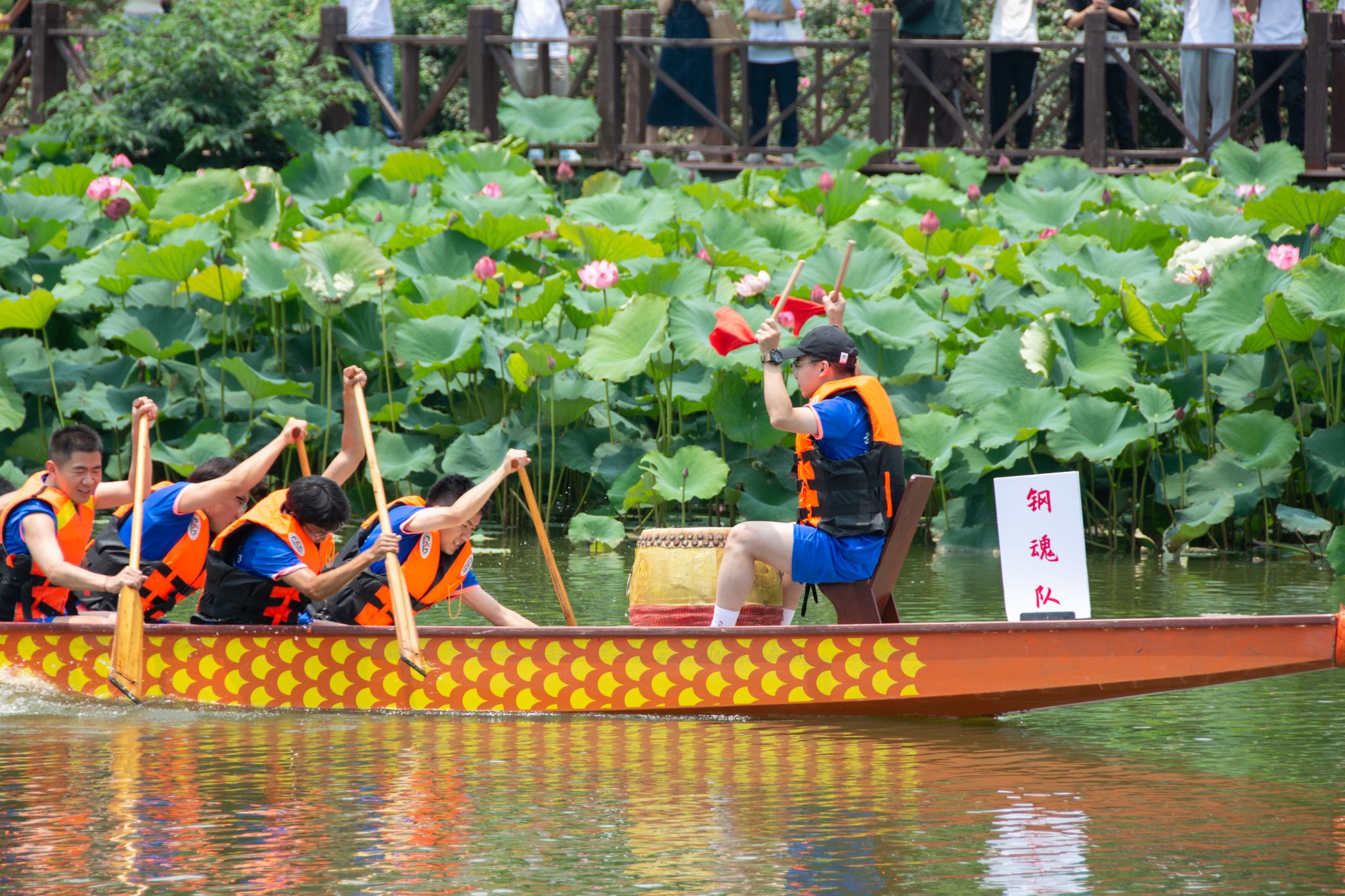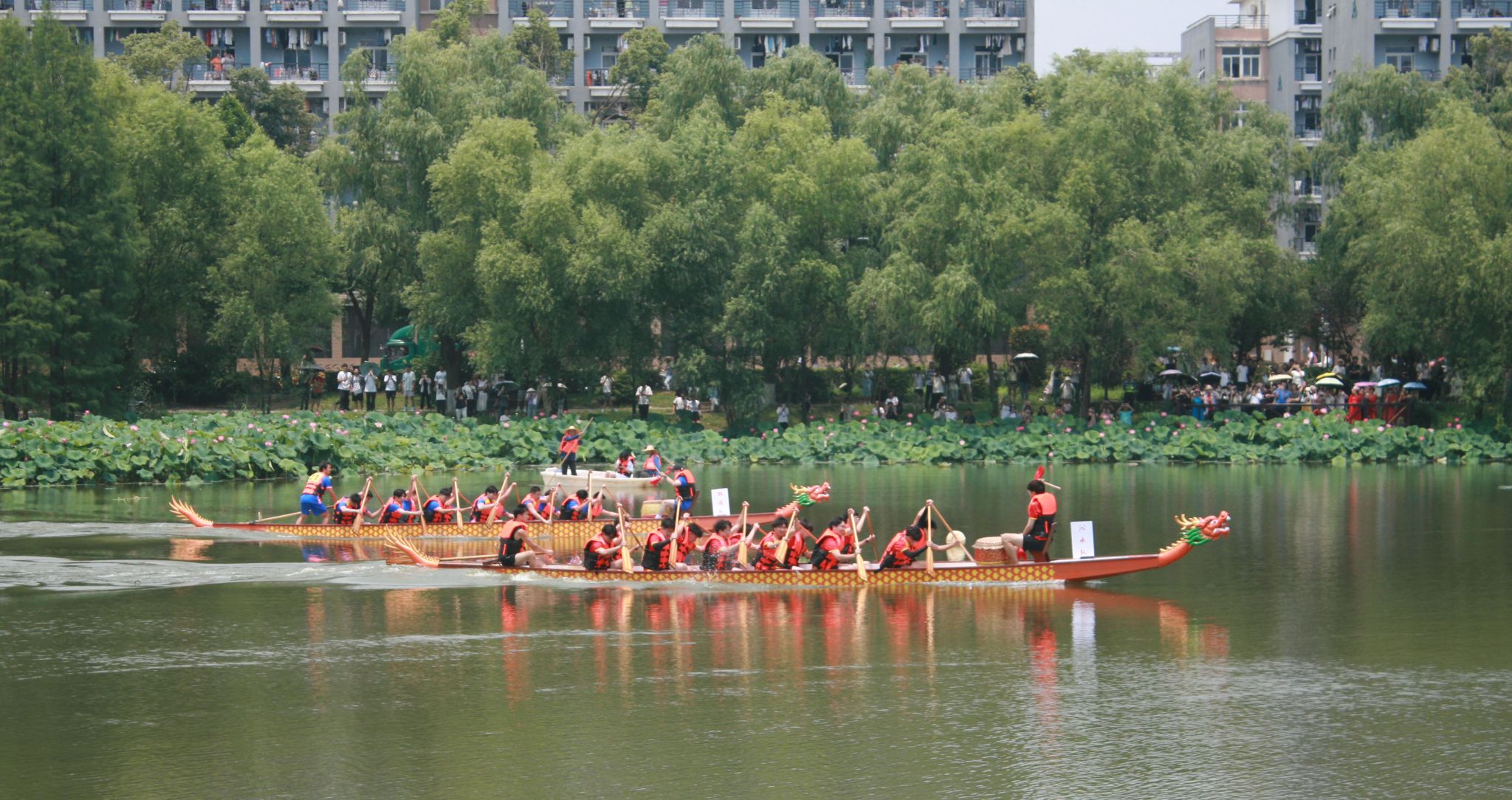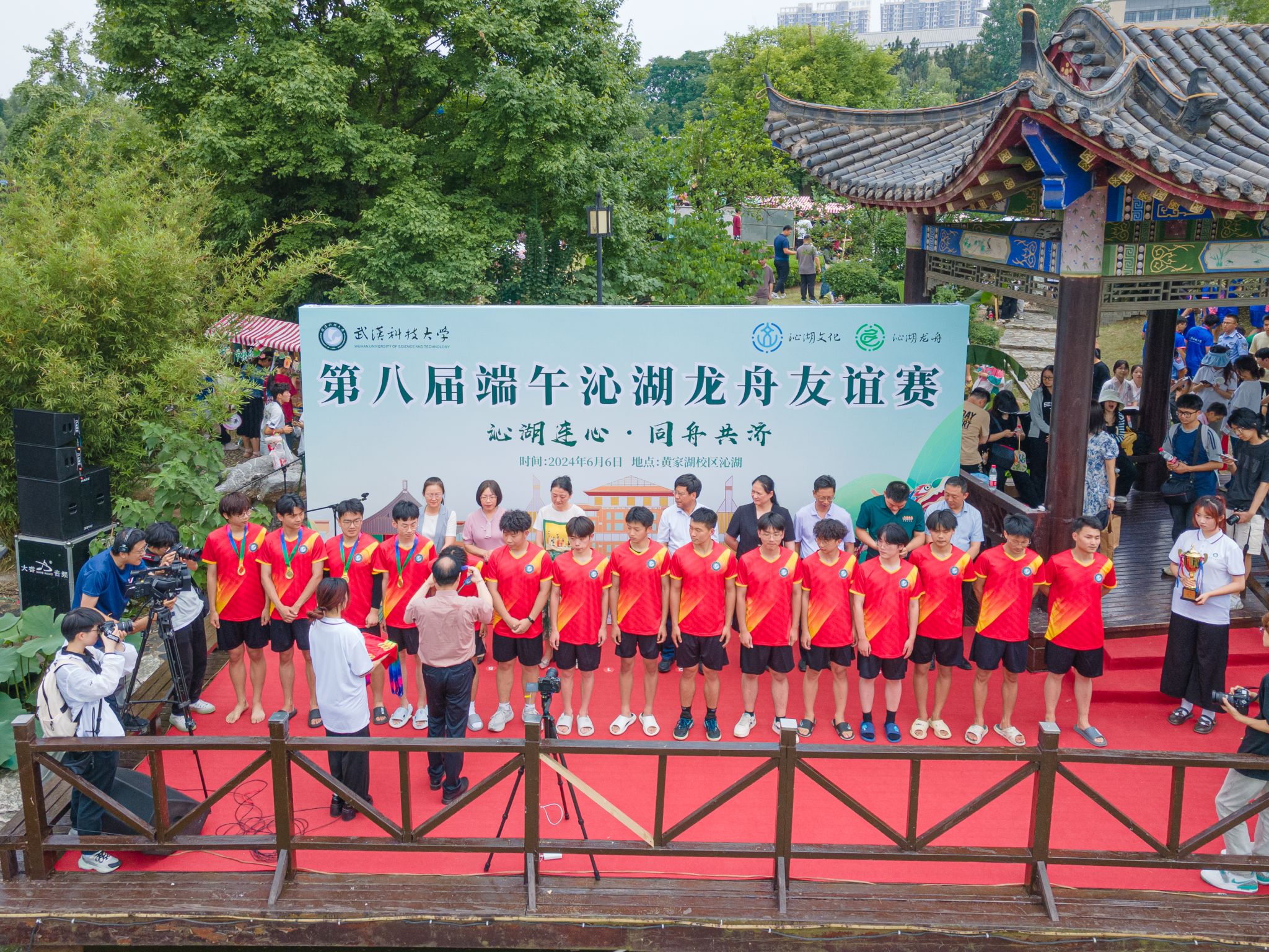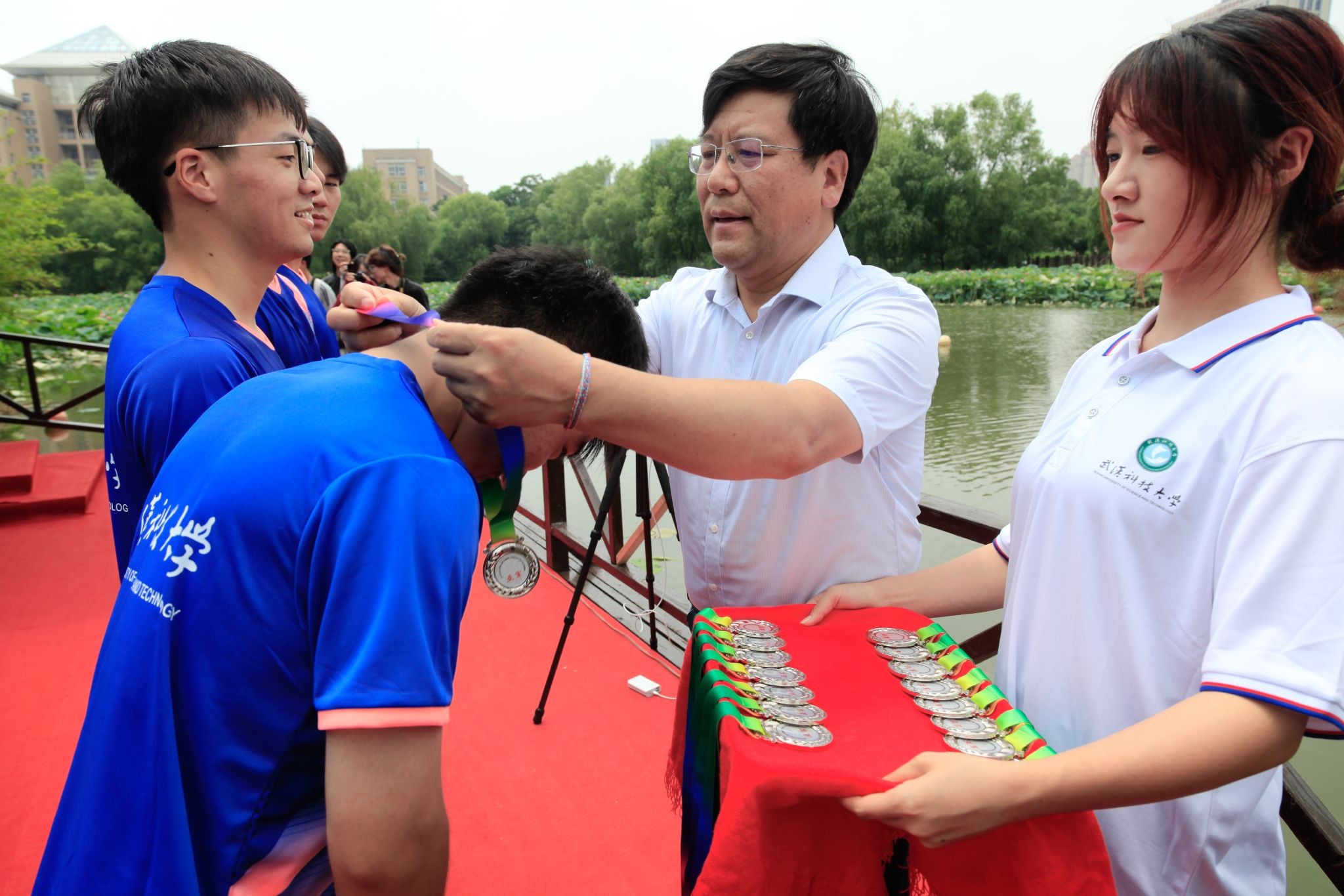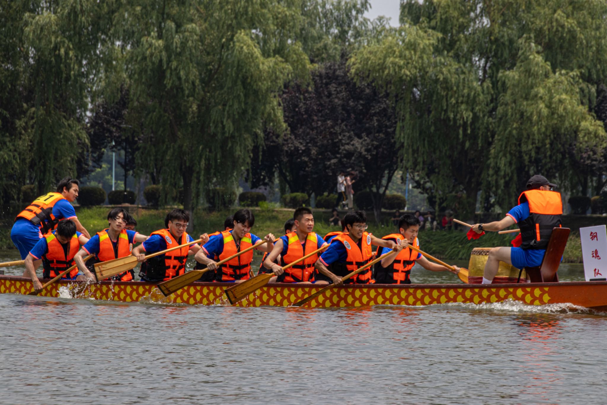6月6日中午,我校于沁湖畔舉辦第八屆“沁湖連心·同舟共濟”端午龍舟友誼賽,副校長沈季偉致辭,校團委副書記向方新宣讀賽事競賽規則、運動員代表宣誓,黨委副書記孫國勝為龍舟點睛。由我校龍舟協會成員組成的“沁水”隊和由研究生組成的“鋼魂”隊角逐龍舟總決賽冠軍,“沁水”隊獲勝。現場還設置了系列端午文化主題展演,不少留學生參與包粽子、做艾草,體驗端午傳統文化。