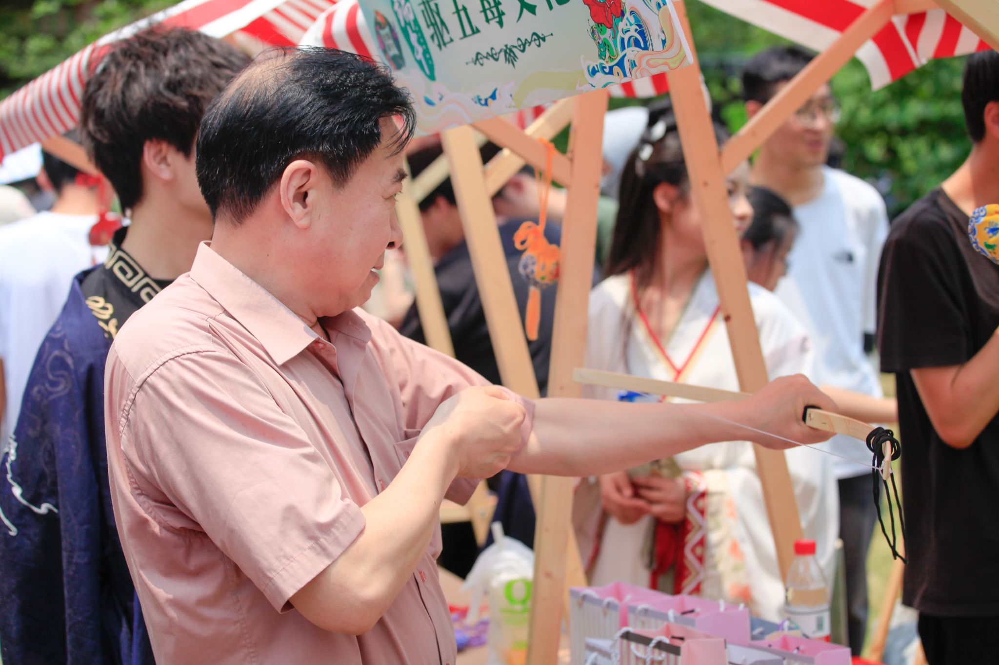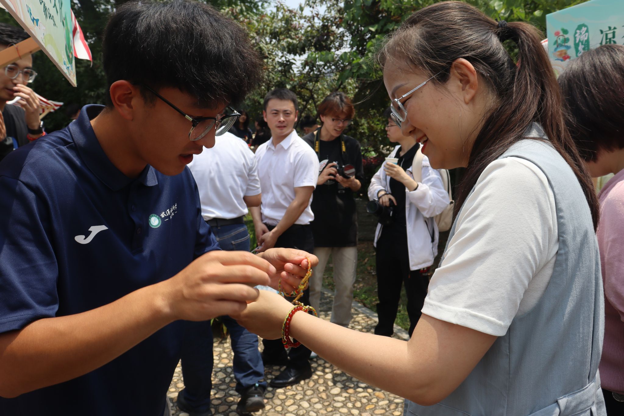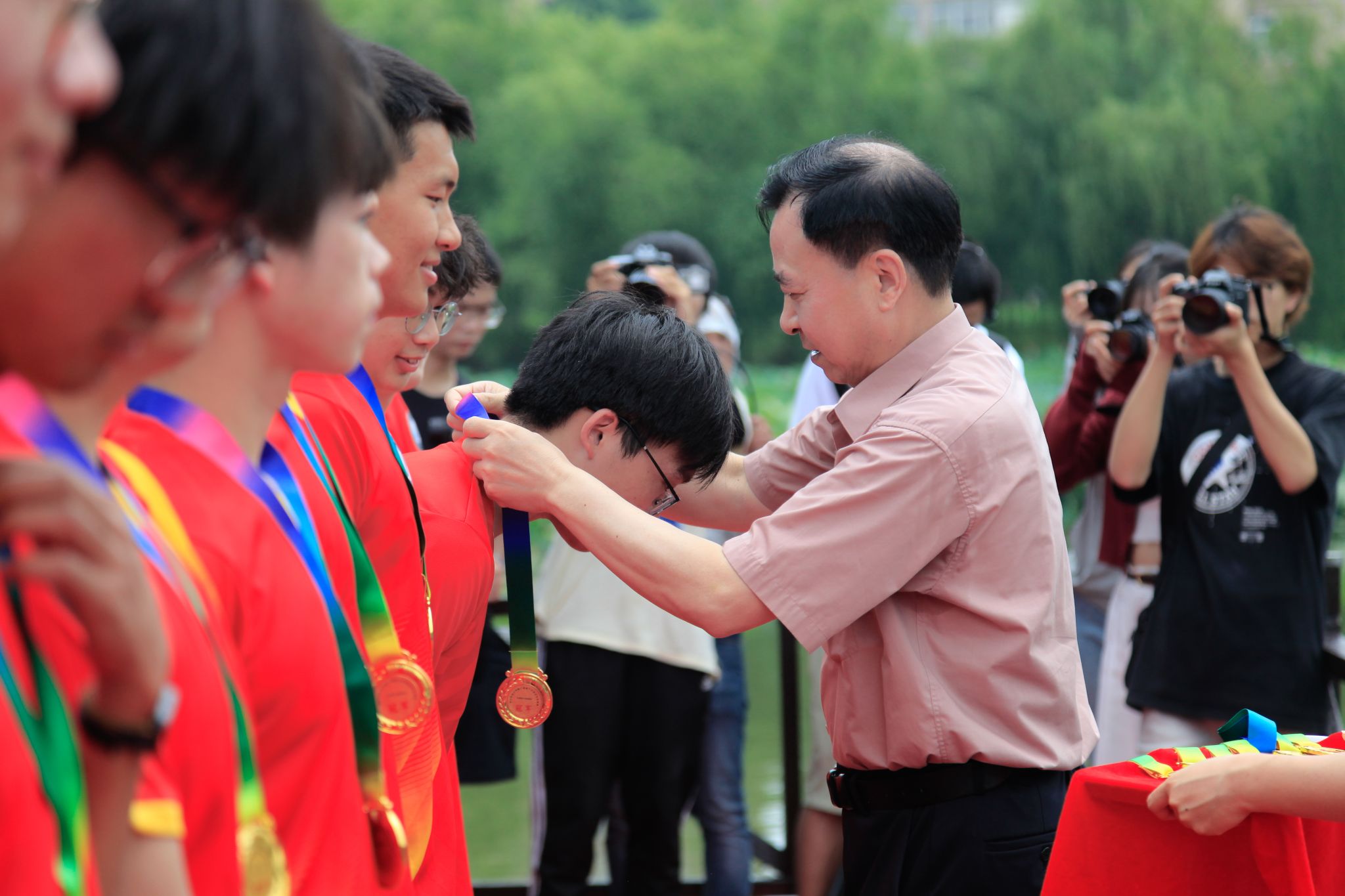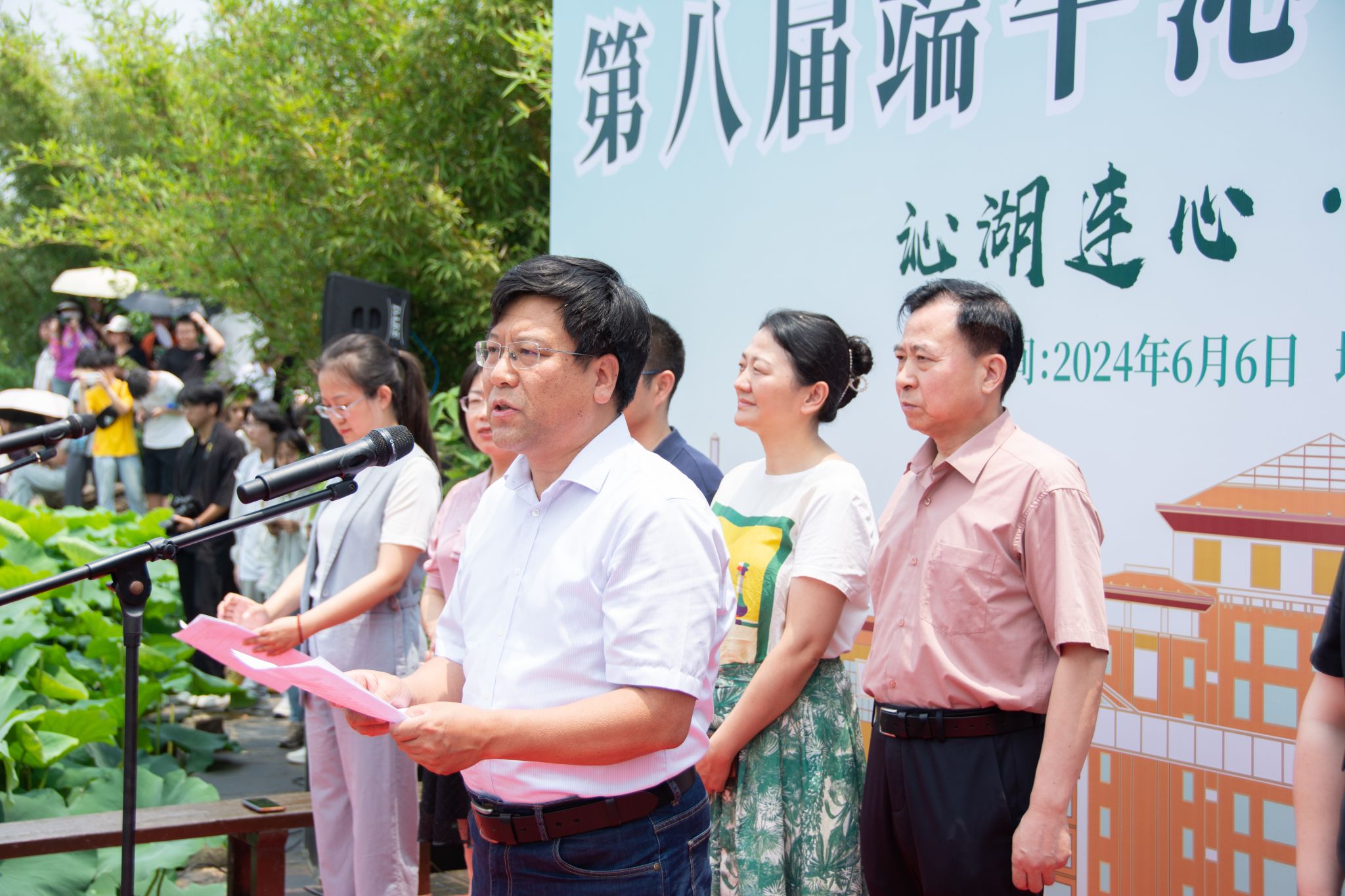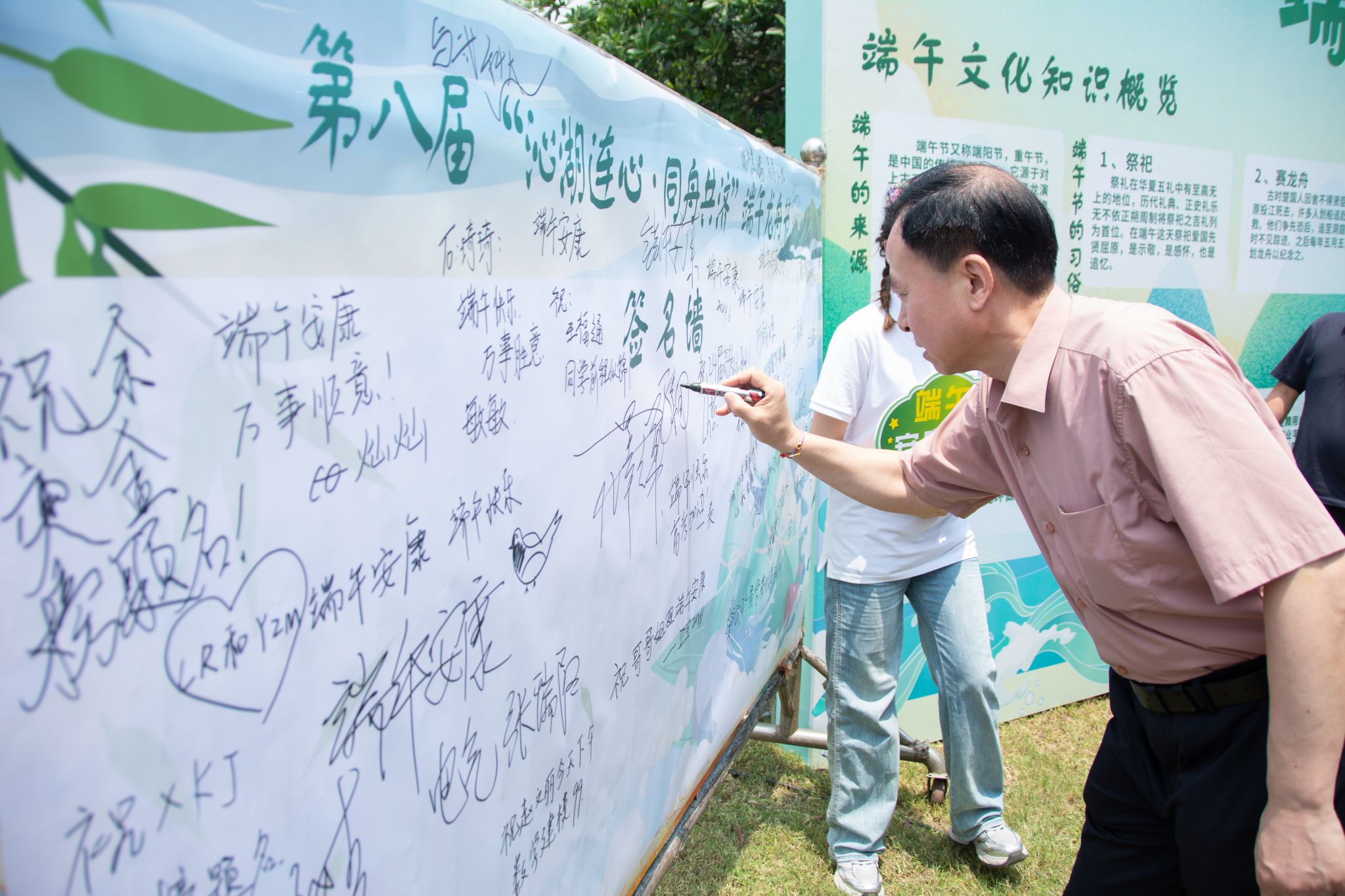 6月6日中午,我校于沁湖畔舉辦第八屆“沁湖連心·同舟共濟”端午龍舟友誼賽,副校長沈季偉致辭,校團委副書記向方新宣讀賽事競賽規則、運動員代表宣誓,黨委副書記孫國勝為龍舟點睛。由我校龍舟協會成員組成的“沁水”隊和由研究生組成的“鋼魂”隊角逐龍舟總決賽冠軍,“沁水”隊獲勝。現場還設置了系列端午文化主題展演,不少留學生參與包粽子、做艾草,體驗端午傳統文化。