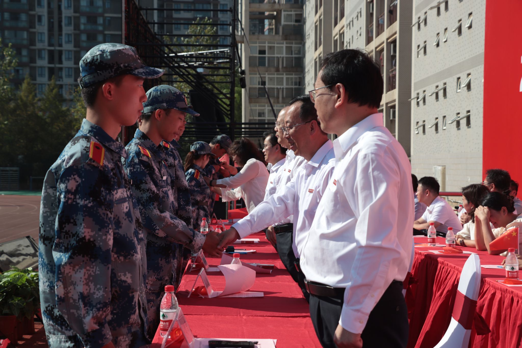 學校全體領導為新生代表佩戴校徽 姜永鴻攝