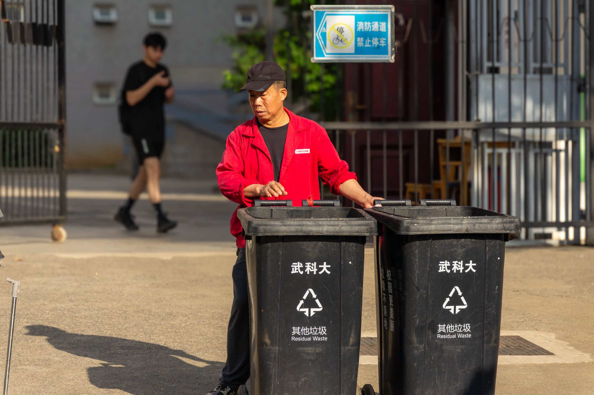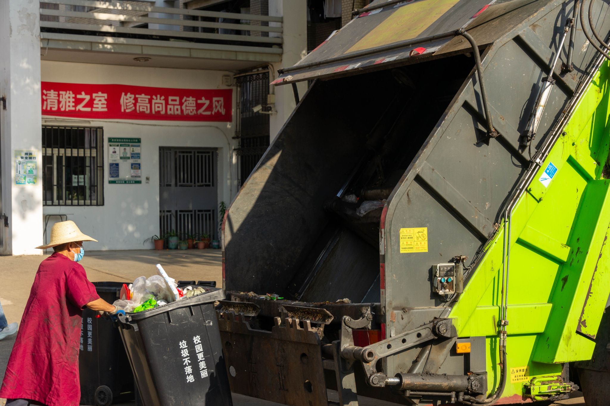 宿舍保潔 張昌勝 將垃圾倒入垃圾車后推垃圾箱返回 王翔宇攝