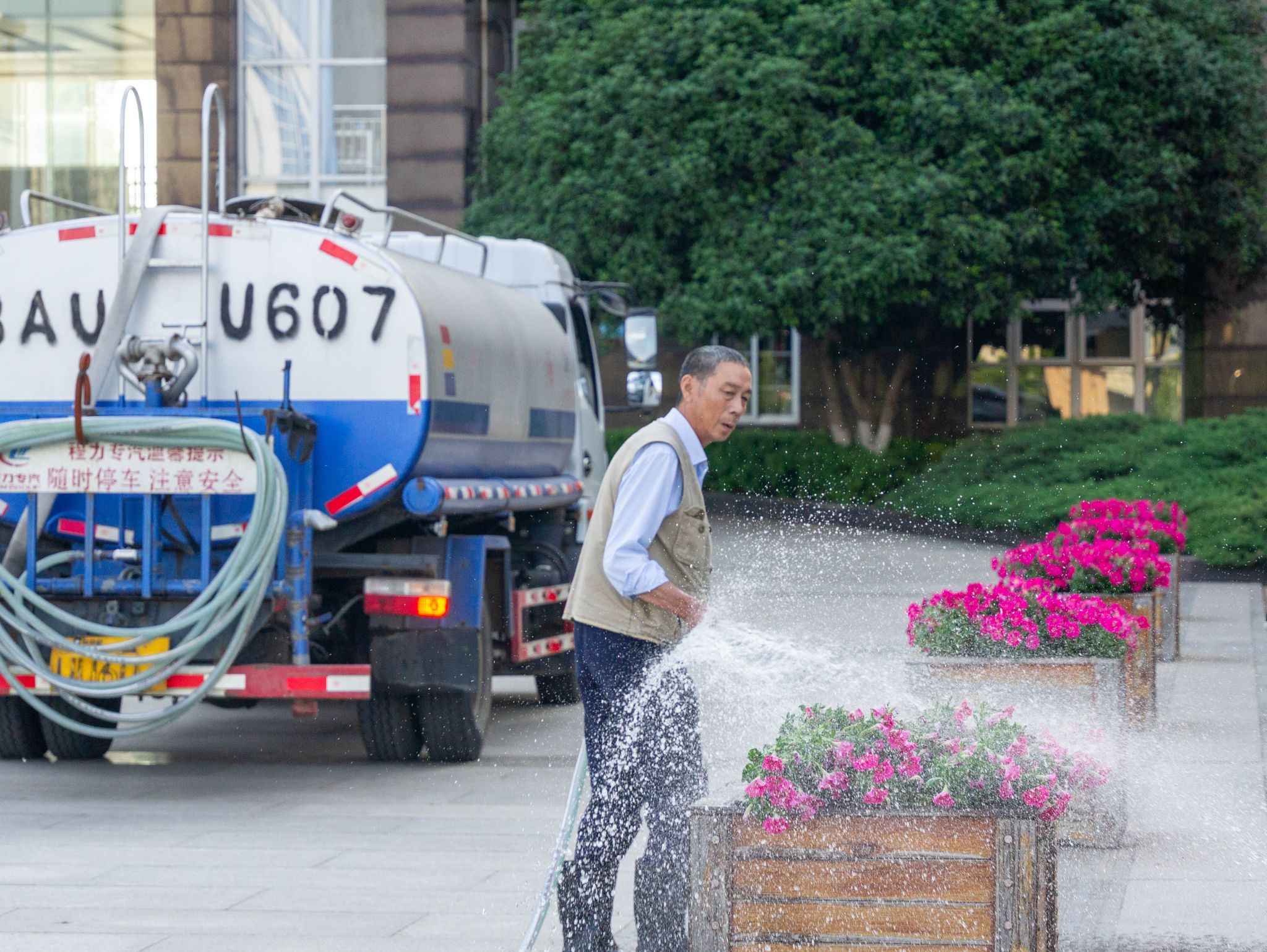澆花師傅 李大元 給教一樓下的花澆水 王翔宇攝