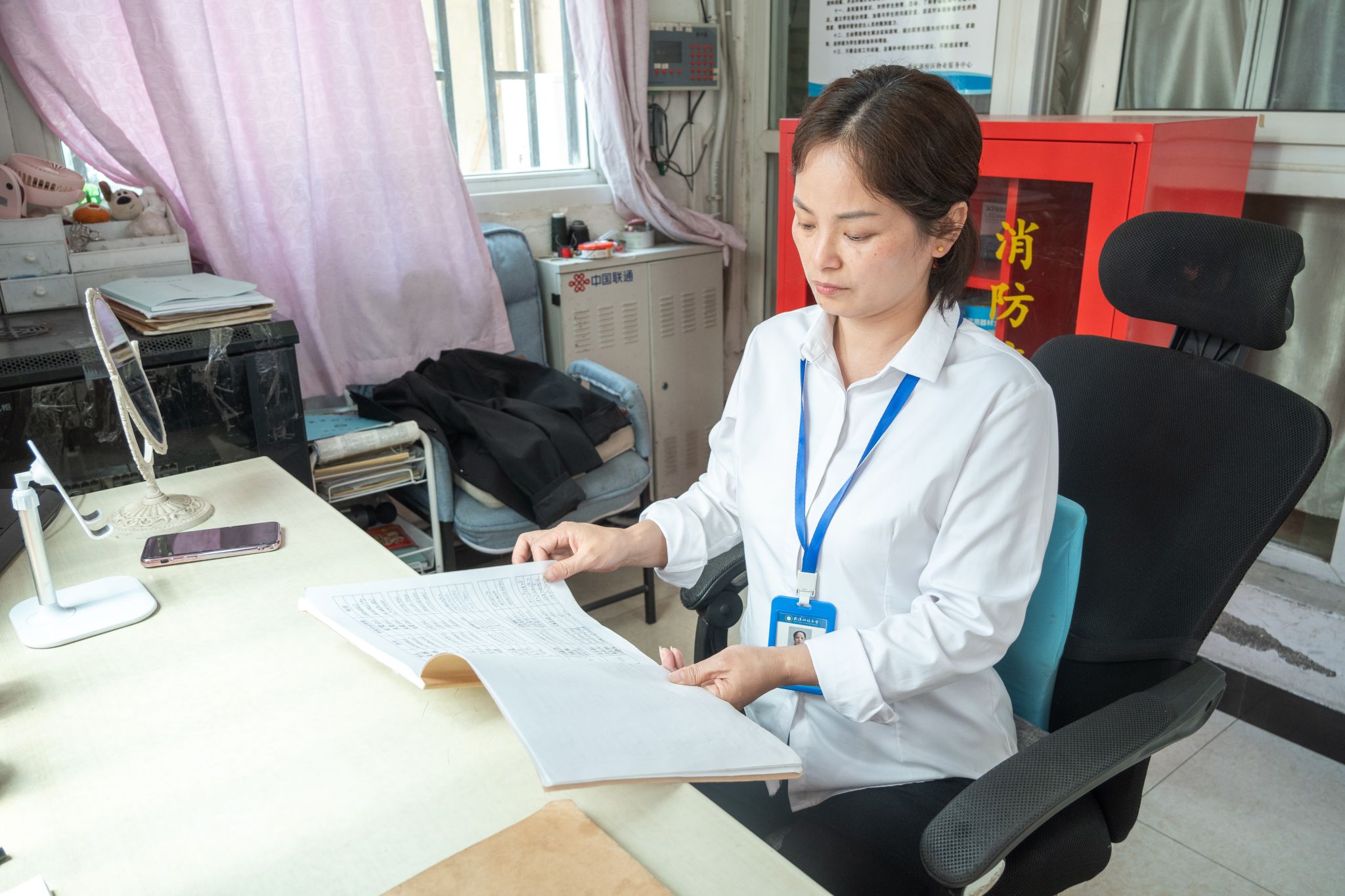 我叫黃萍,來武科大14年了,是一名宿管阿姨。我的日常工作包括幫沒帶鑰匙的同學開門、幫學生縫補衣扣、幫同學保修宿舍問題等一些瑣碎的小事。只要學生需要,我都會盡力幫忙,能幫到他們,我就很高興!