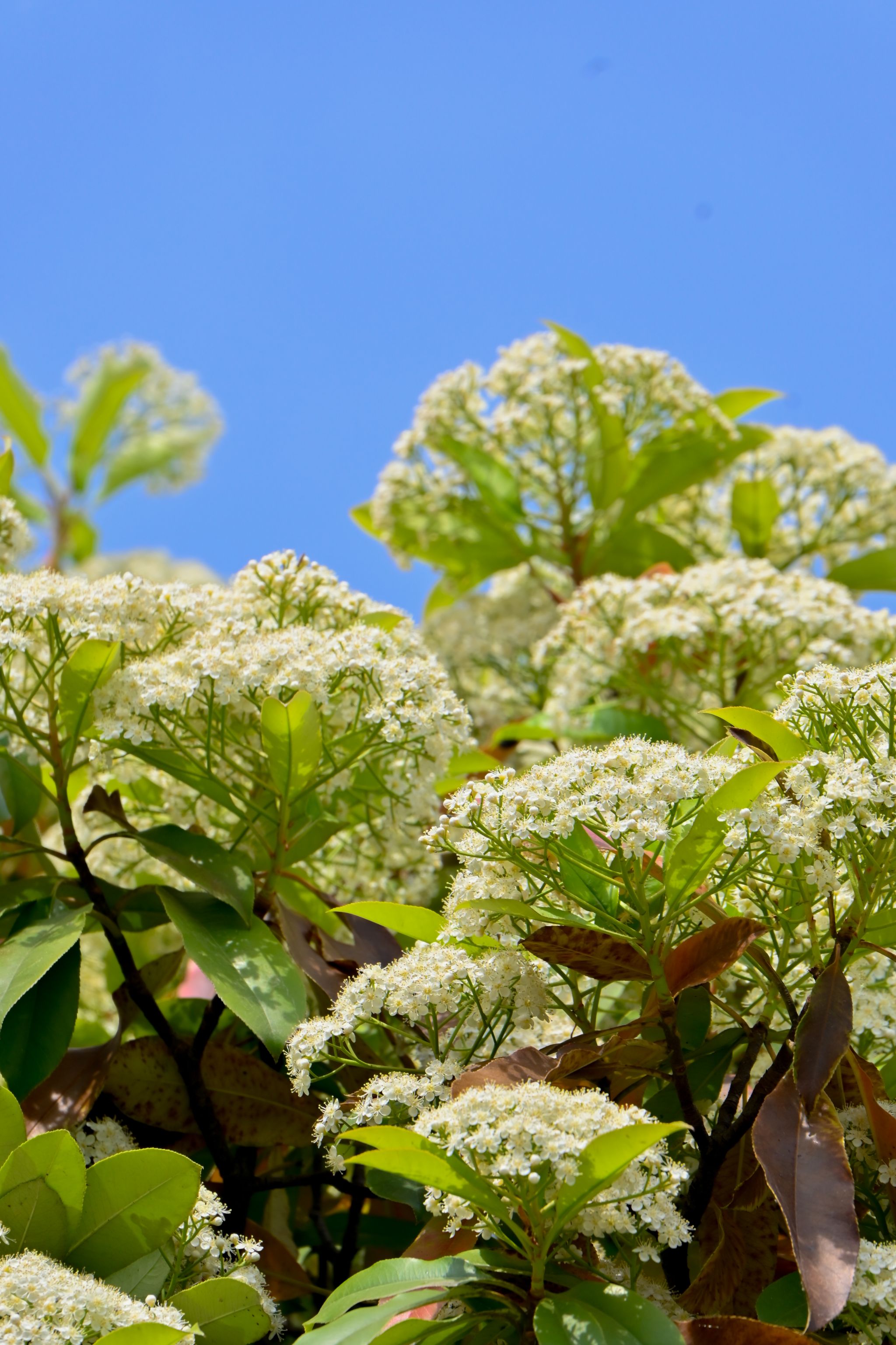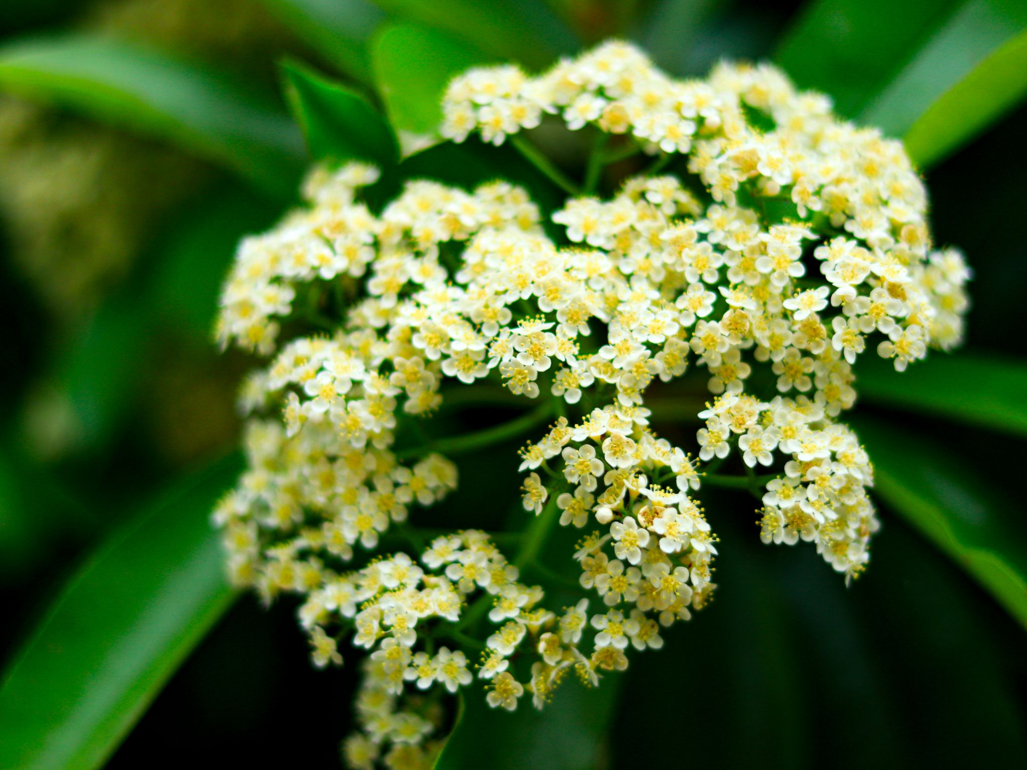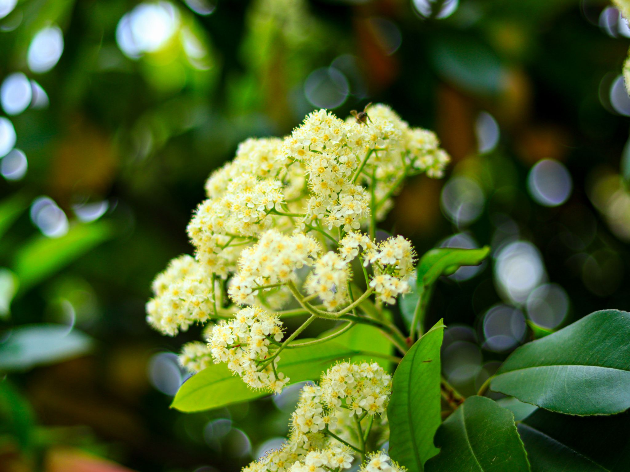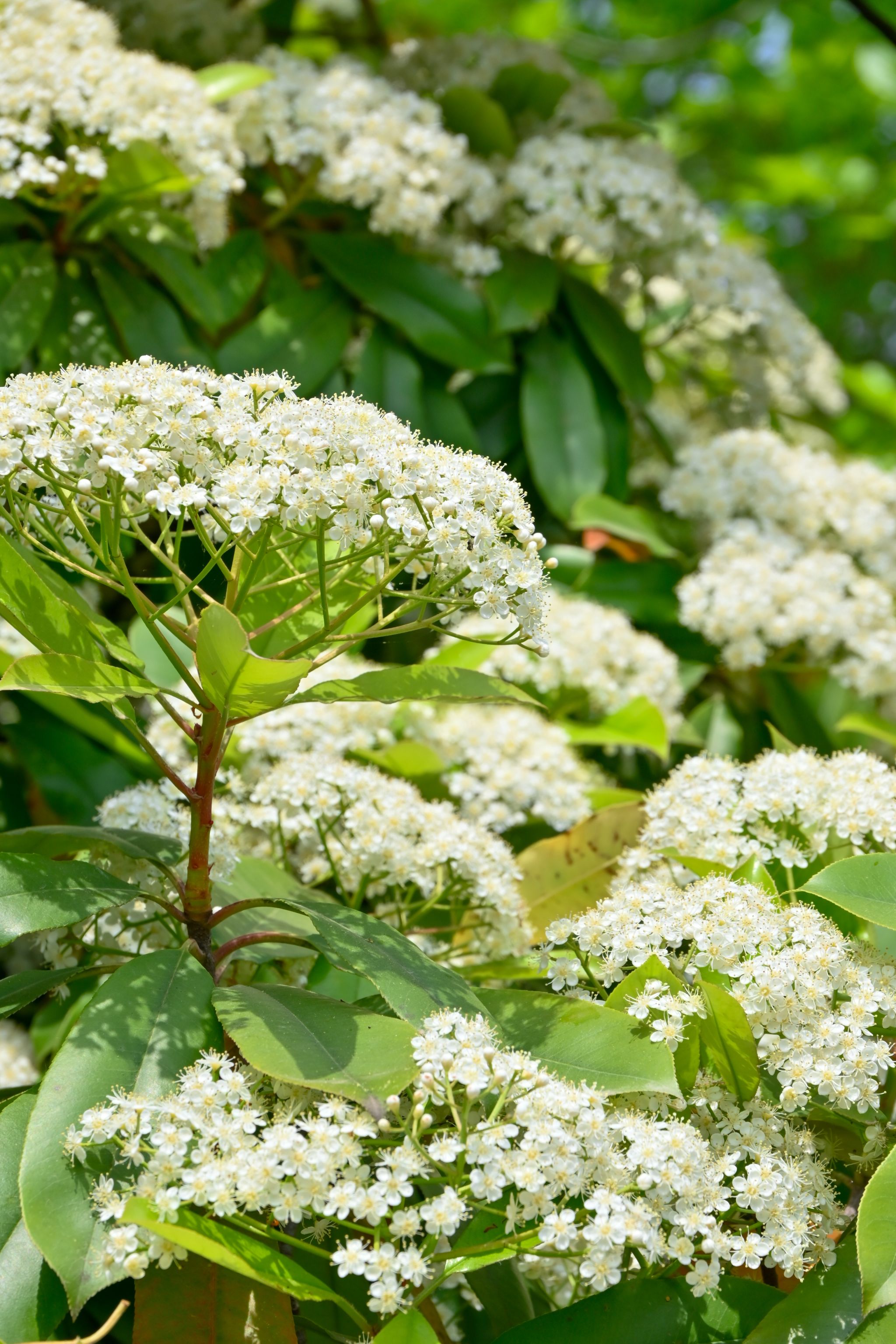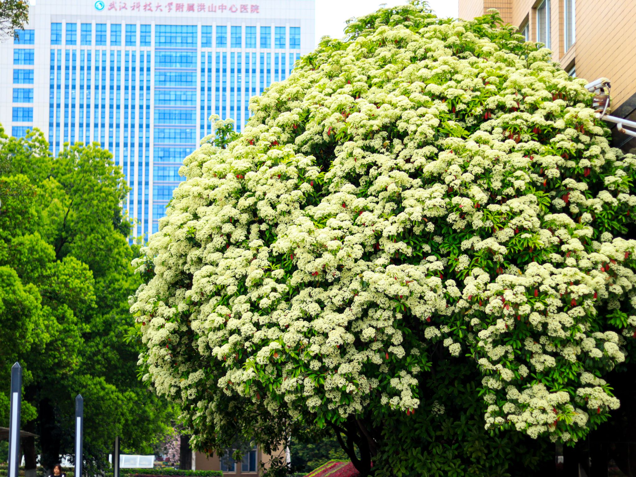 石楠花是薔薇科石楠屬常綠灌木或小喬木,別名千年紅、扇骨木。葉片革質(zhì),長橢圓形,春季開花,白色小花密集成頂生復(fù)傘房花序,雖花形小巧,但花量繁多。石楠花喜光耐旱,抗病蟲害能力強,常作為城市綠化樹種,可凈化空氣、隔離噪音其花語是“孤寂、莊嚴(yán)”。花期在4-5月,我校教一樓、教二樓周邊和沁心島可見。