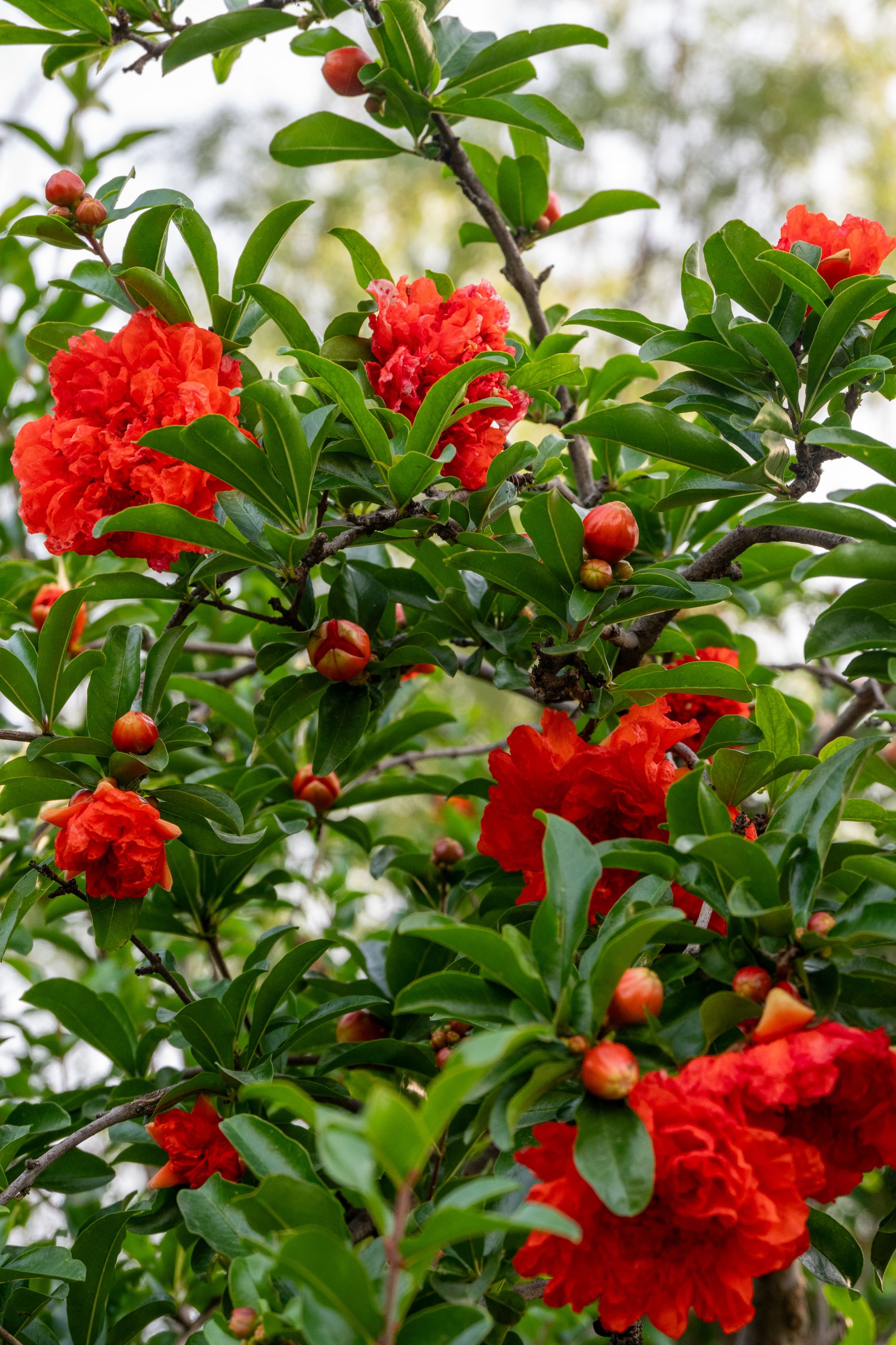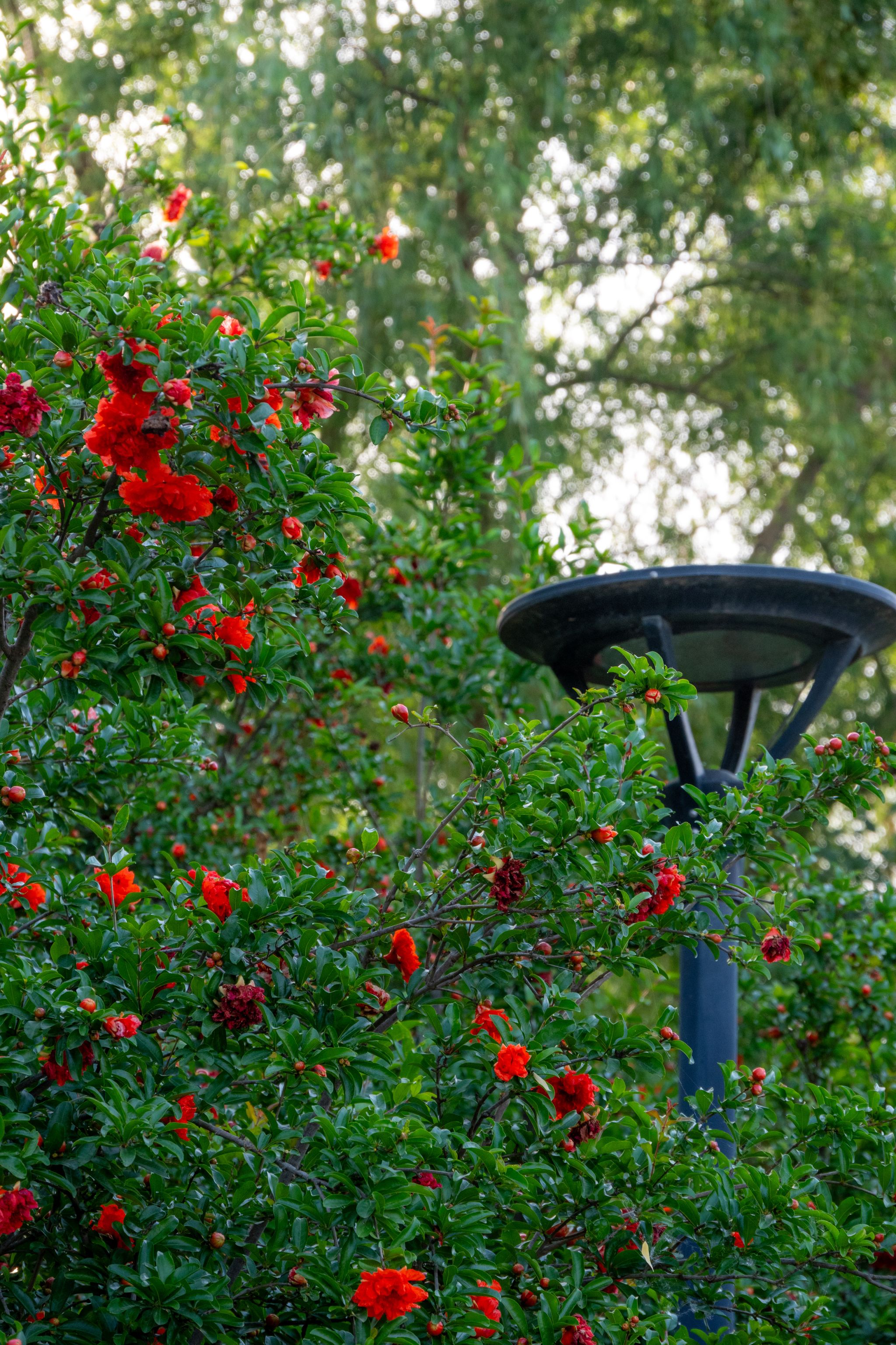石榴花為石榴科石榴屬落葉灌木或小喬木,別名安石榴、丹若。葉片對生或簇生,矩圓形,花朵單生或數(shù)朵頂生,花瓣肉質(zhì),有鮮紅、粉紅等色,花萼鐘形,艷麗奪目。它喜溫暖向陽,適合在陽臺、庭院種植。石榴花的花語是“成熟的美麗”與“多子多福”,因其果實飽滿、籽粒眾多,象征著家族興旺。除觀賞外,石榴花可泡茶,果實富含維生素 C,具有較高的食用價值。花期在5-6月,我校百花園、沁心島周邊、國際學(xué)院附近可見。