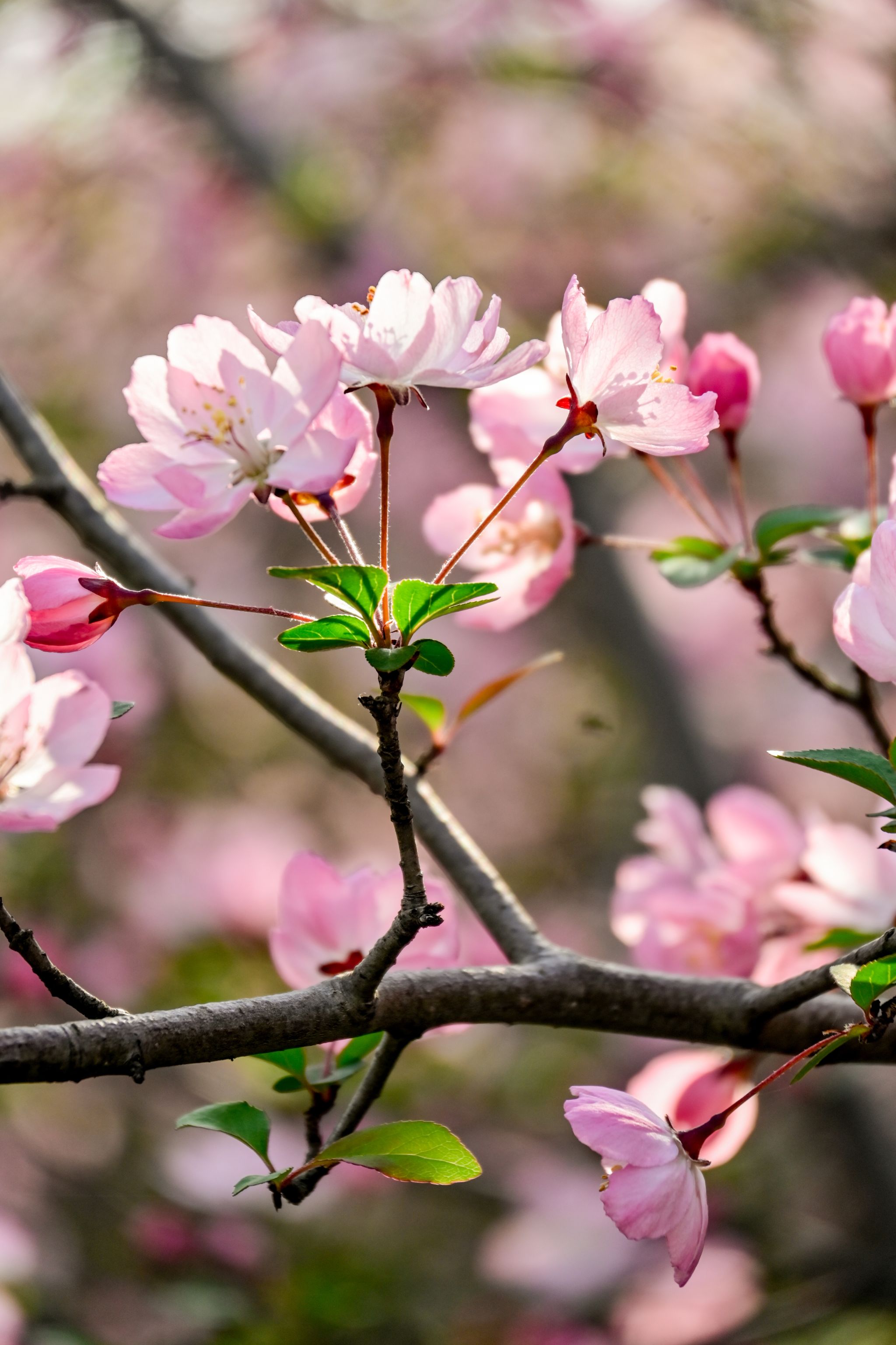 垂絲海棠是薔薇科蘋果屬落葉小喬木,因花梗細(xì)長下垂而得名,別名垂枝海棠、海棠花等。其葉片卵形或橢圓形,春季開花時,粉紅色花朵簇生于枝頭,花瓣呈倒卵形,花梗紫色,宛如粉霞垂落。它喜光且耐寒,多栽植于庭院、公園等地作觀賞樹,果實可食用或釀酒。垂絲海棠的花語是 “游子思鄉(xiāng)、離愁別緒”,寄托著對故鄉(xiāng)的眷戀之情。花期在3-4月,我校在櫻園、梅園可見。