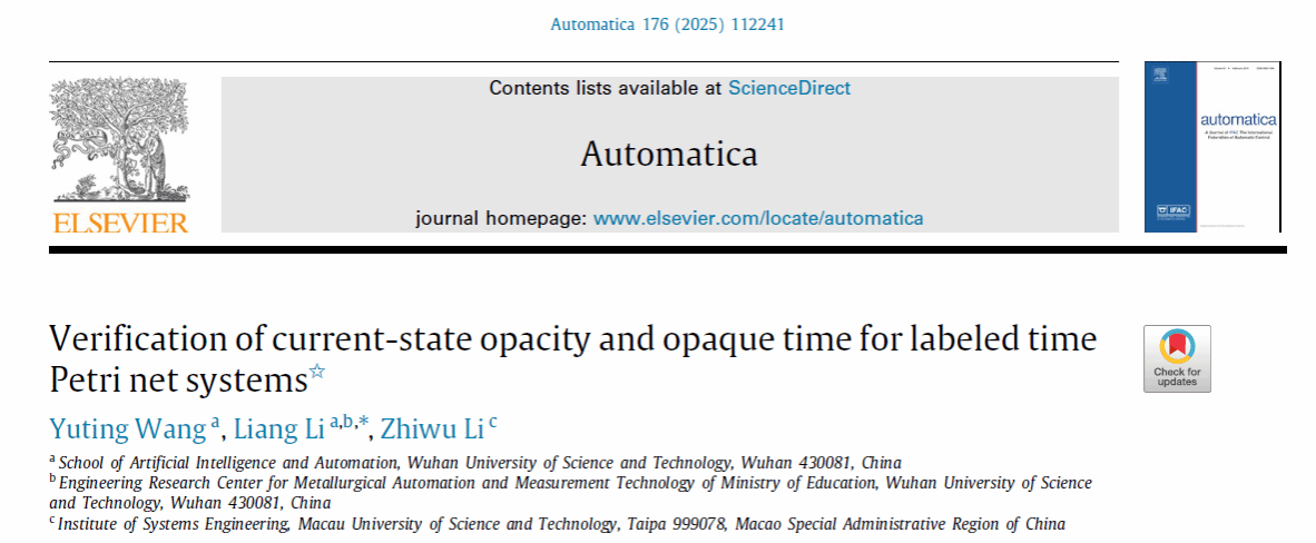 武科大網訊 近日,我校人工智能與自動化學院碩士研究生在國際控制領域頂級期刊《Automatica》上以長文(Regular Paper)形式發表題為“Verification of Current-State Opacity and Opaque Time for Labeled Time Petri Net Systems”的研究論文。該論文第一作者為我校2022級碩士研究生王宇婷,其導師黎良擔任通訊作者,武漢科技大學為論文的第一完成單位。