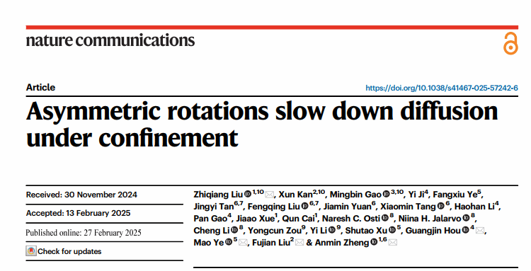 武科大網訊 近日,我校核磁共振與分子科學交叉研究院/化學與化工學院教授劉志強、鄭安民團隊與中科院大連化物所、福州大學合作,在《Nature Communications》發表了題為“Asymmetric rotations slow down diffusion under confinement”的論文(DOI:10.1038/s41467-025-57242-6)。該研究發現了分子篩限域空間存在弱相互作用的小分子運動慢的反常擴散現象,闡明了限域空間非對稱旋轉抑制擴散的微觀機制,為多孔材料分離領域提供了重要的理論指導。論文通訊作者為劉志強,侯廣進、葉茂、劉福建和鄭安民教授,我校為論文第一單位。