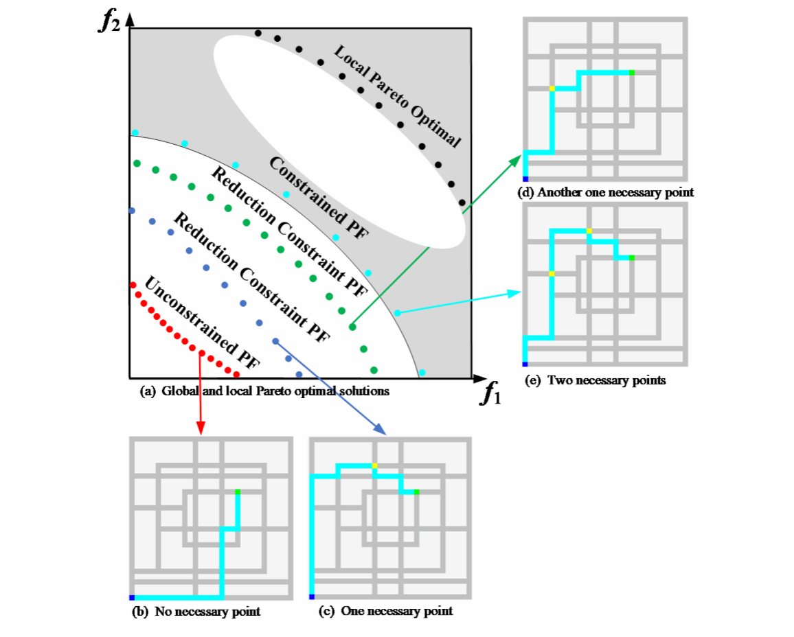 一是基于約束支配原則(Constraint Dominance Principle, CDP)的路徑比較策略。該策略通過將每個必要點建模為獨立約束,并引入約束滿足度量機制,允許算法在進(jìn)化過程中保留部分不可行但潛在優(yōu)良解,有效穿越不可行區(qū)域,最終逼近真實的受約束帕累托前沿(Constrained Pareto Front)。