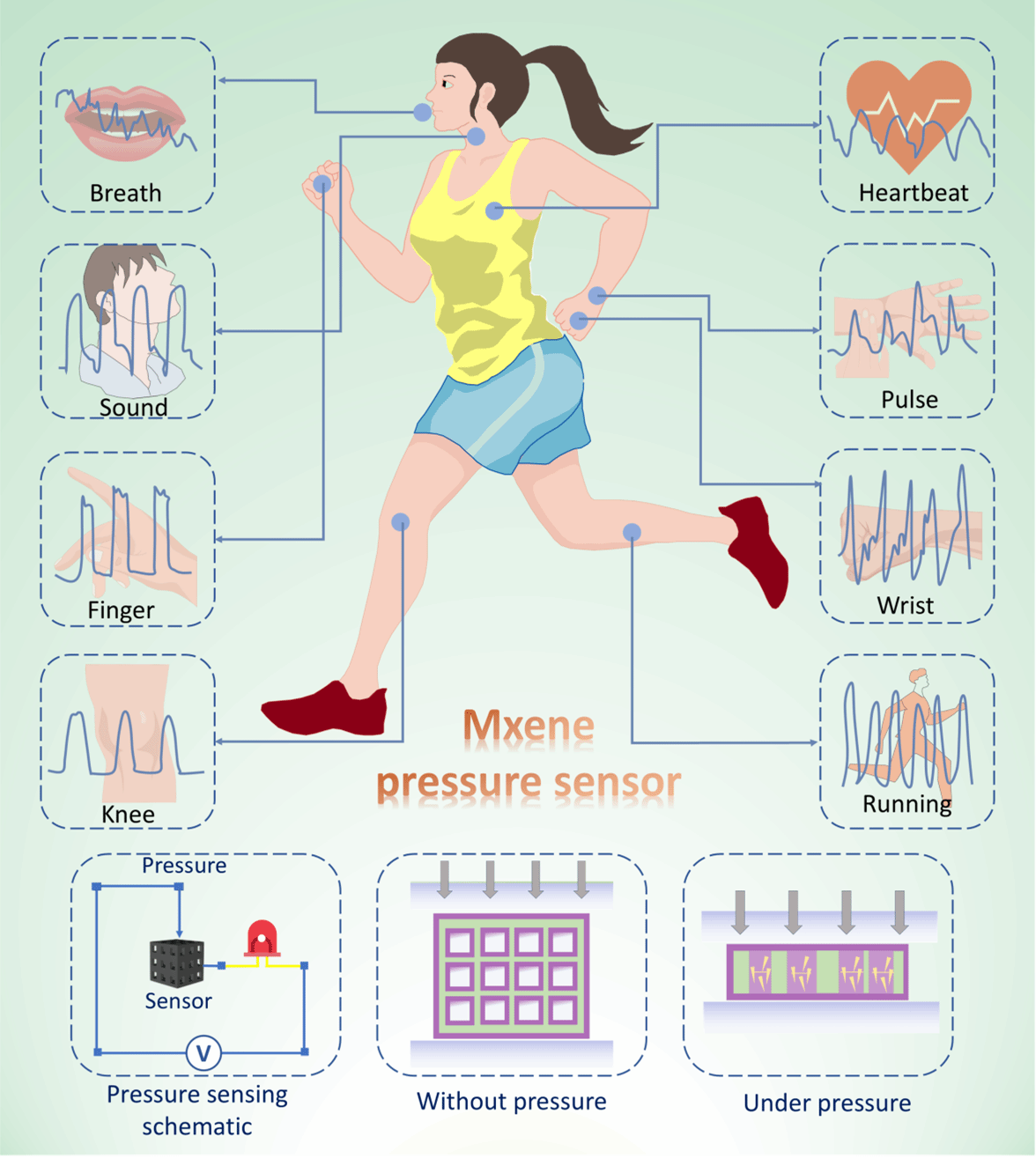 MXene是一種新型二維過渡金屬碳/氮化物,具有高導(dǎo)電性、優(yōu)異的機(jī)械柔性和豐富的表面官能團(tuán)。其獨(dú)特的層狀結(jié)構(gòu)使其對外界壓力極為敏感,能夠?qū)毫π盘柛咝мD(zhuǎn)化為電阻變化。與石墨烯、黑磷等傳統(tǒng)二維材料相比,MXene在穩(wěn)定性、可加工性方面表現(xiàn)更優(yōu),尤其在潮濕或高溫環(huán)境下仍能保持性能穩(wěn)定,這為柔性傳感器的實(shí)際應(yīng)用奠定了基礎(chǔ)。MXene傳感器在醫(yī)療監(jiān)測、智能穿戴、軟體機(jī)器人等前沿領(lǐng)域的應(yīng)用潛力。