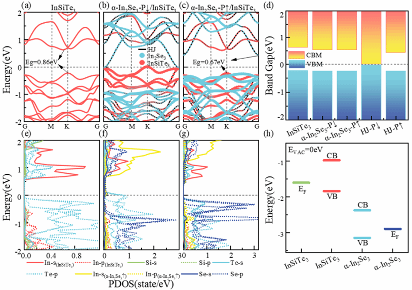 研究團隊以二維鐵電材料α-In2Se3和二維半導體材料InSiTe3為研究對象,構建了構建二維范德華異質結。通過改變α-In2Se3的極化狀態,發現異質結的Eg可以通過鐵電極化的反轉來調節,鐵電極化從0 eV(InSiTe3/α-In2Se3?P↓) 至0.75 eV(InSiTe3/α-In2Se3?P↑),實現了從0到1的邏輯狀態控制,說明了鐵電極化的變化影響了電荷的移動,從而實現對光學性能的調制效果。