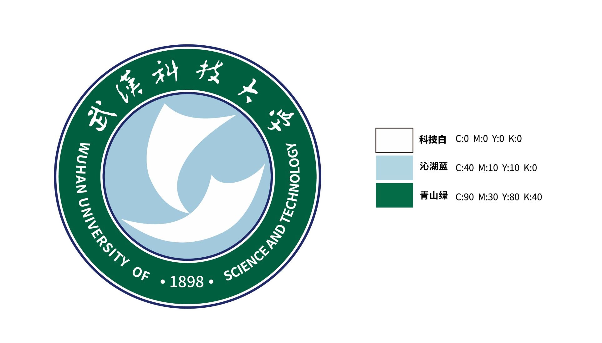 校徽主色調由科技白(C:0 M:0 Y:0 K:0)、沁湖藍(C:40 M:10 Y:10 K:0)和青山綠(C:90 M:30 Y:80 K:40)三色構成。科技白象征創新、先進、嚴謹,代表學校優勢特色的“大冶金”學科;沁湖藍象征智慧、理性、未來,代表學校新興交叉的“大數據”學科;青山綠象征生命、健康、青春,代表學校融合發展的“大健康”學科,三色組合凸顯學校“一主兩翼”的學科體系。同時沁湖藍、青山綠也意喻“沁水青山”的美麗校園。 |